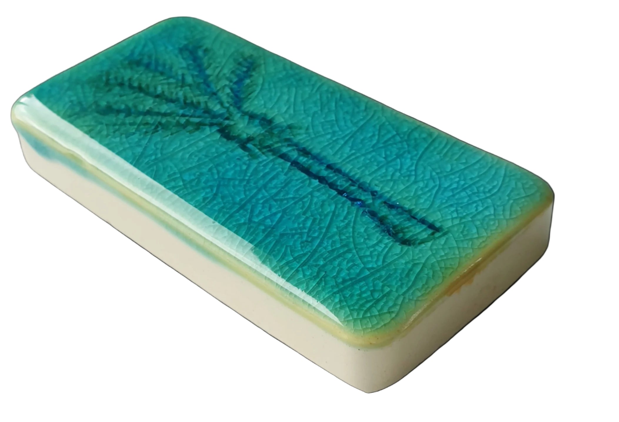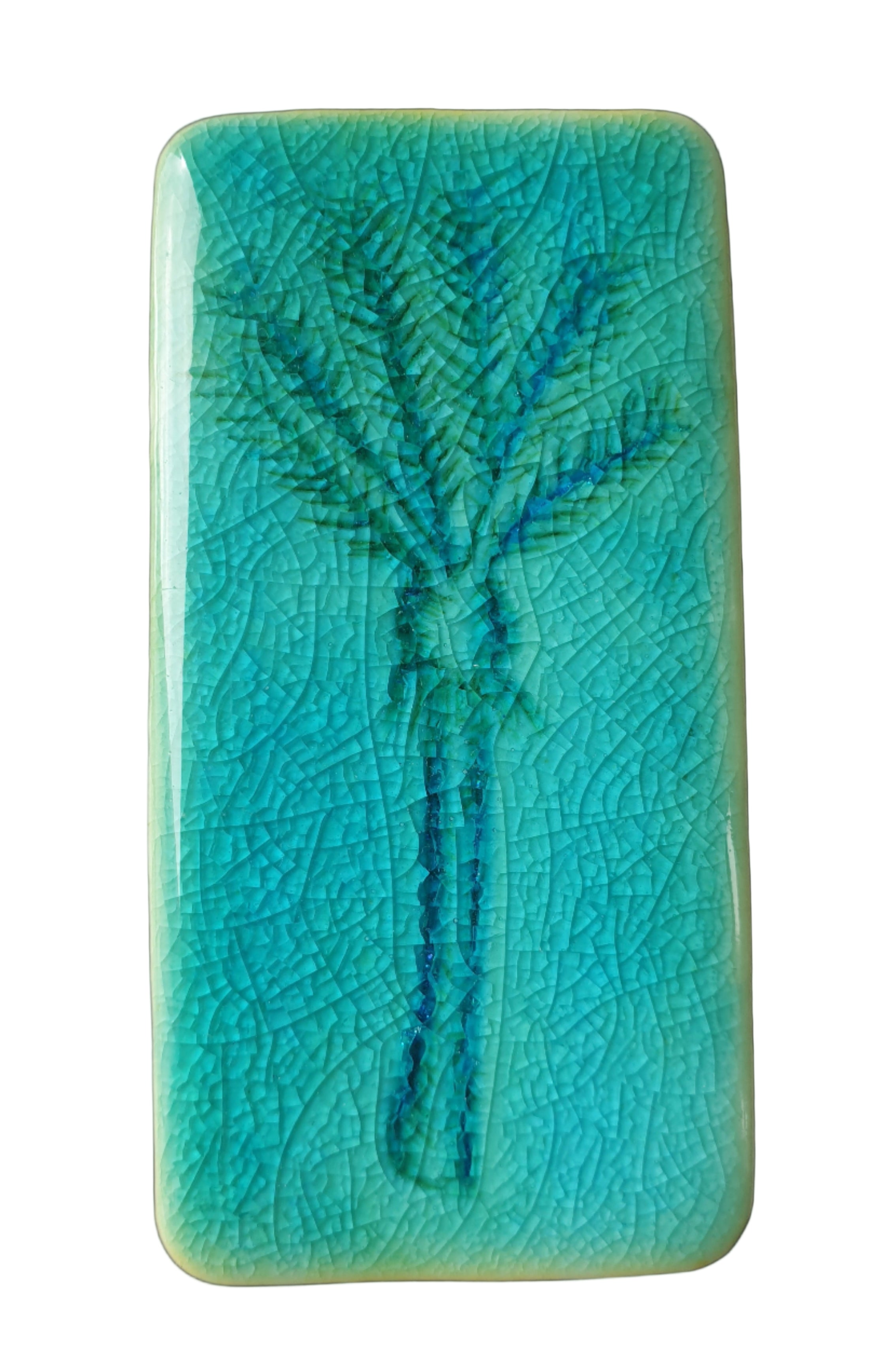 This small handcrafted pottery wall tile by New Zealand ceramic artist Jo Luping features a stylised Nikau palm, rendered in rich turquoise and teal glazes with a softly crackled finish. The organic form and colour palette give the piece a calm, distinctly New Zealand feel.