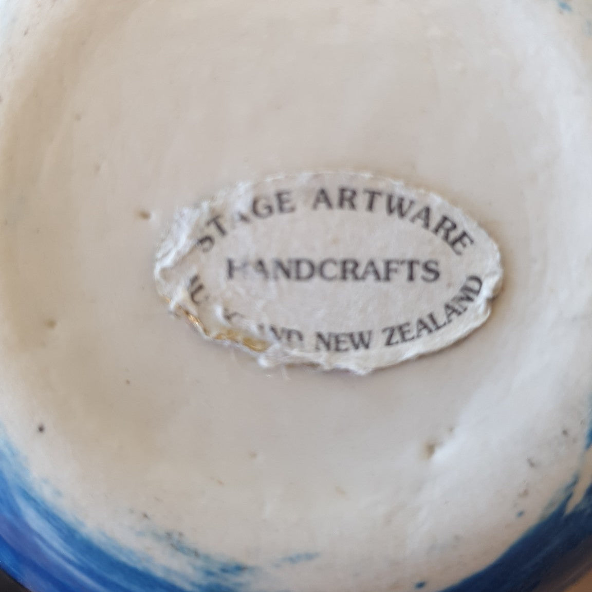 It is in very good vintage condition, with no cracks or chips observed. The interior shows light staining and natural glaze variation consistent with age and prior use. The original Stage Artware paper label remains present on the base, with expected wear.
