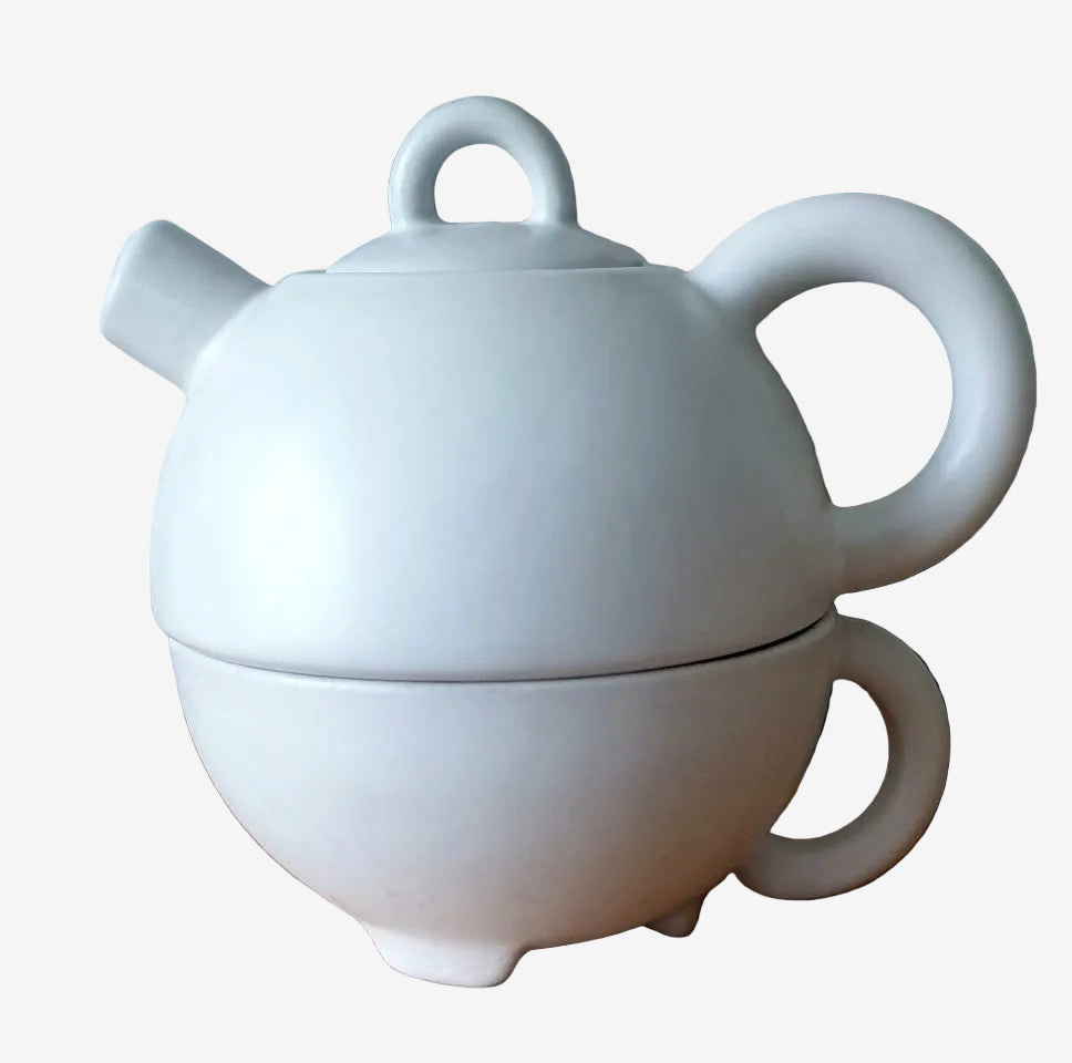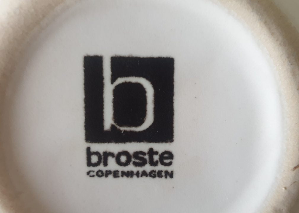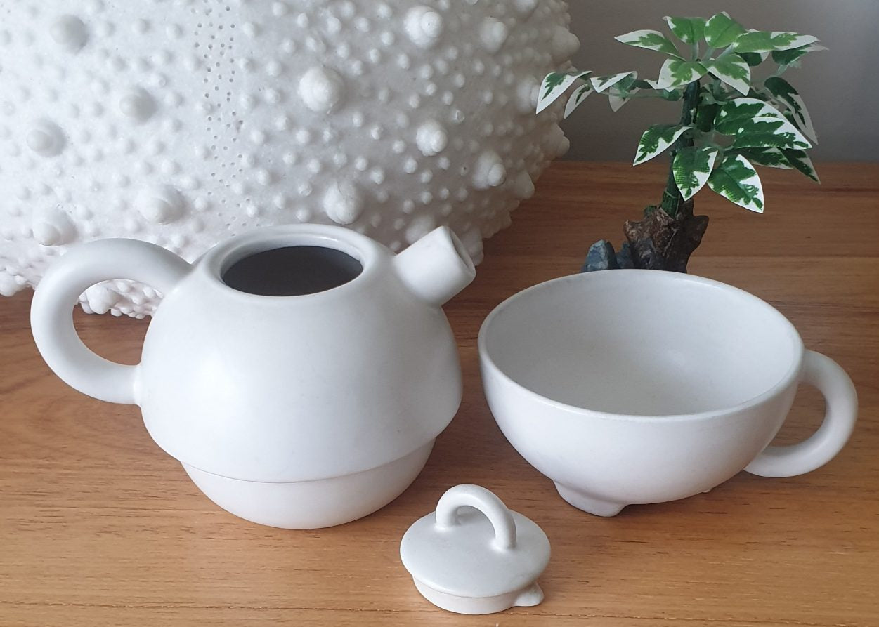 A lovely find for fans of Danish pottery. An excellent display collectable or keep using it to brew your favourite tea. Danish modern design tea for one / tea pot with a cup by Broste Copenhagen in a mat glaze off white ceramic. Design reminiscent of late-1980s Memphis-era Danish modernism. Broste Copenhagen is one of Scandinavia’s leading interior design houses, based in Copenhagen and originates back to 1955.