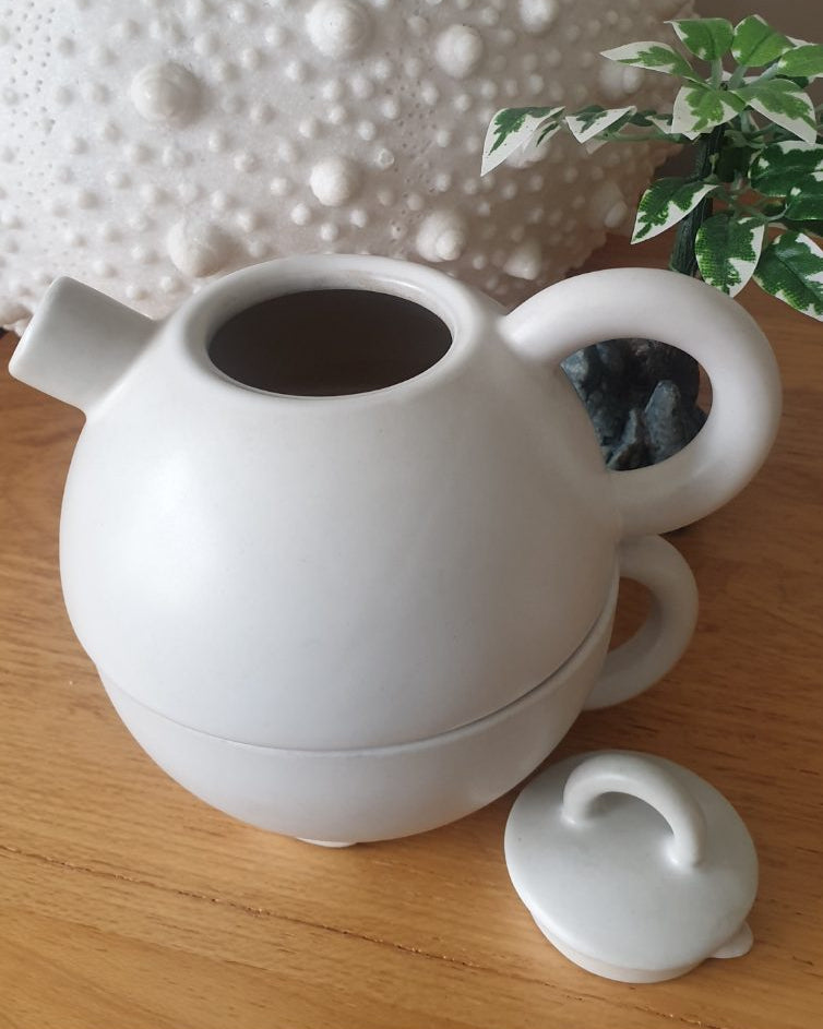 Attractive Danish-designed stacking teapot and cup from Broste Copenhagen, circa 1980s, in a soft off-white glaze. A clever, sculptural design that displays beautifully and remains fully functional for everyday tea.