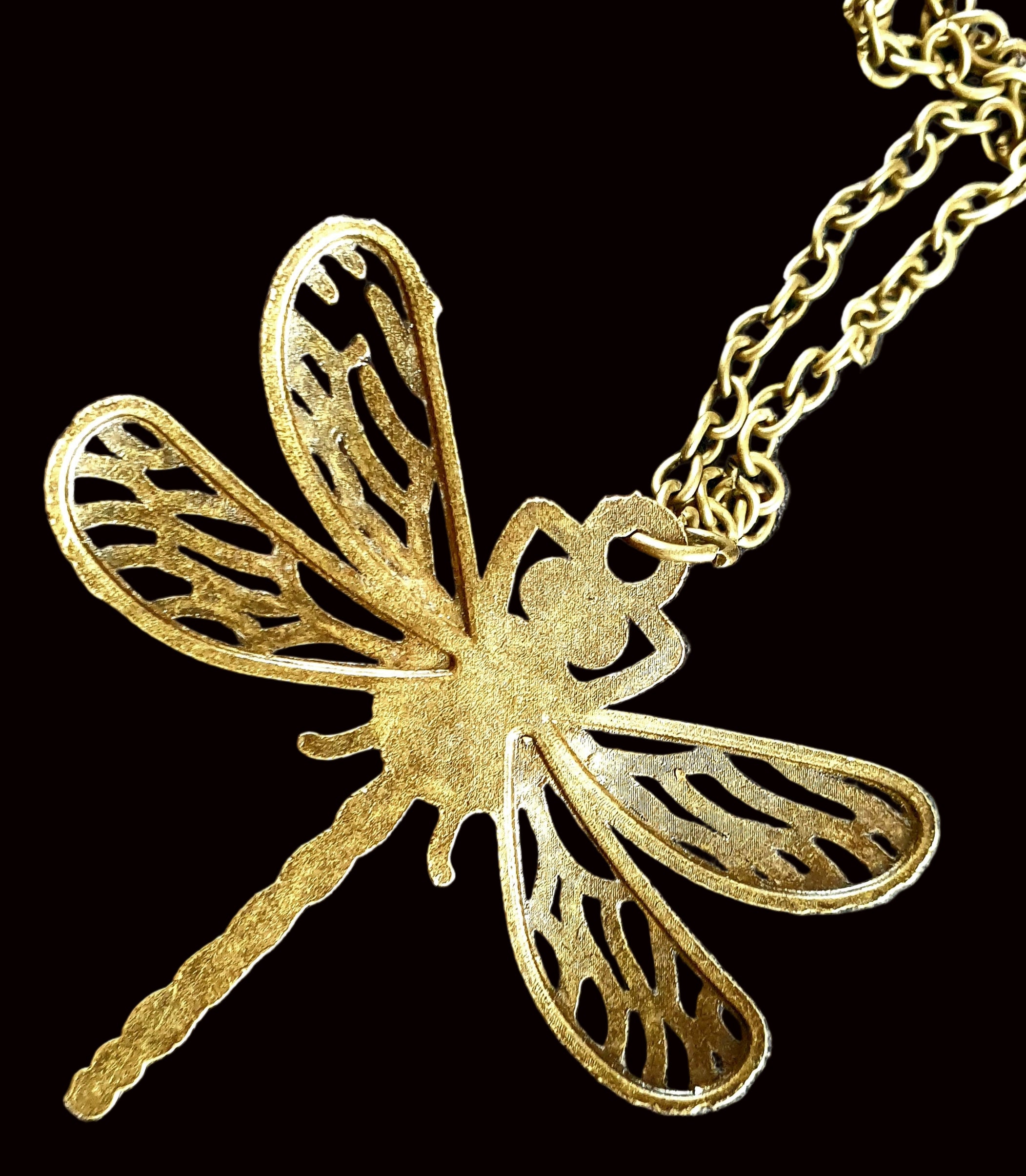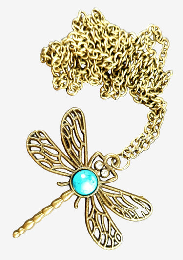 Insect lovers rejoice! A pretty fashion necklace with faux turquoise stone. The pendant sits on an antique tone (browny gold) metal alloy chain. Could be a cute addition to a steampunk outfit!