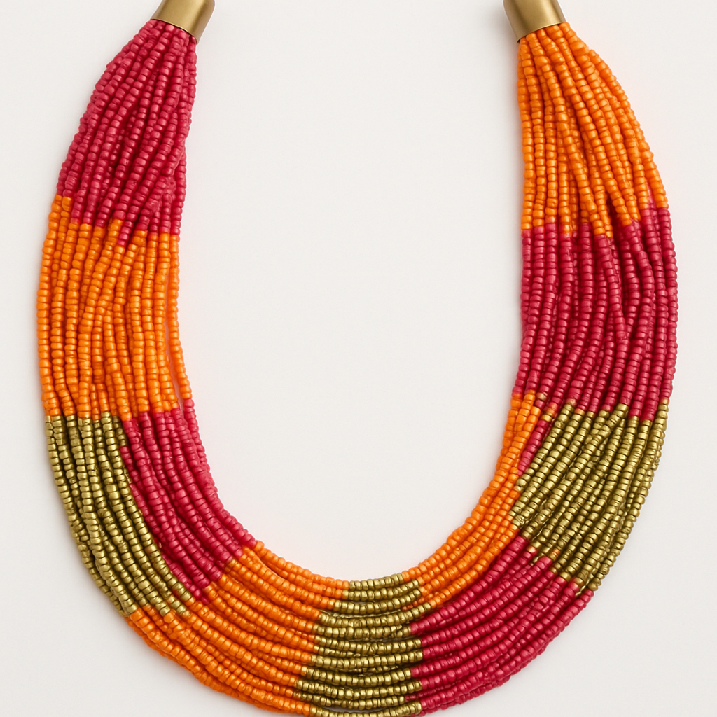 This modern day necklace gives a stunning 70s boho vibe.Ā  Fifteen strands of beads combined into one fabulous statement piece.Ā  Lovely sunset colours, gold, burnt orange and raspberry pink.