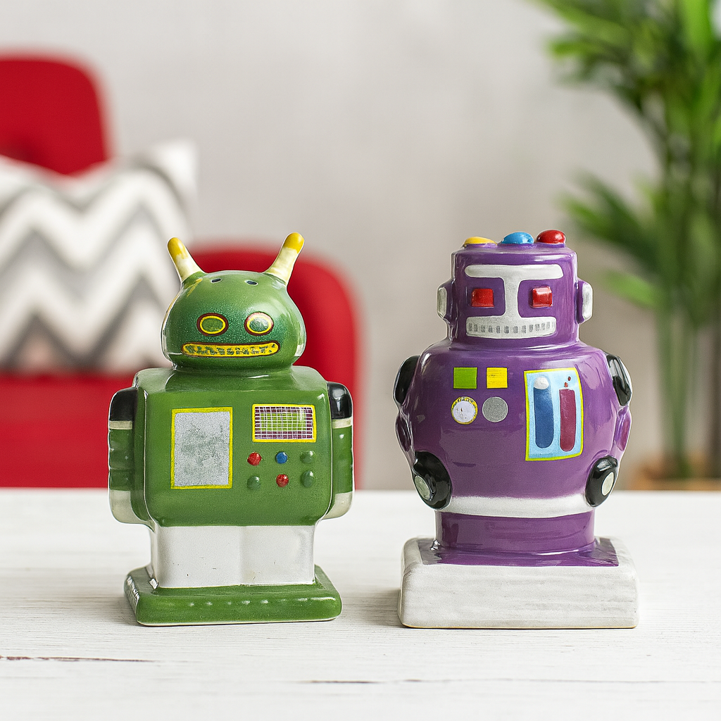 Pass the salt please.Ā Ā Beep bop affirmative!Ā Ceramic old fashioned robots salt and pepper shaker set.Ā These items are brand new.