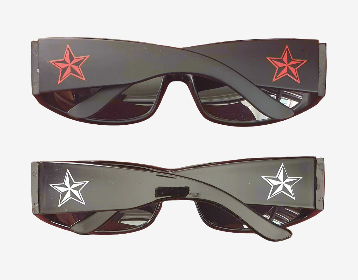 Lucky last pairs, in a choice of glossy black with white star on each side, or matt black with red star each side. Smokey grey lenses.
