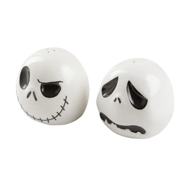 A cheeky pair of ceramic black and white Jack Skellington salt & pepper shakers from the Nightmare Before Christmas. Their cute but spooky design adds a wicked touch to your table setting, perfect for Nightmare Before Christmas fans. Great size too, 7cm wide x 6.5cm tall. Rubber stoppers in the base base.