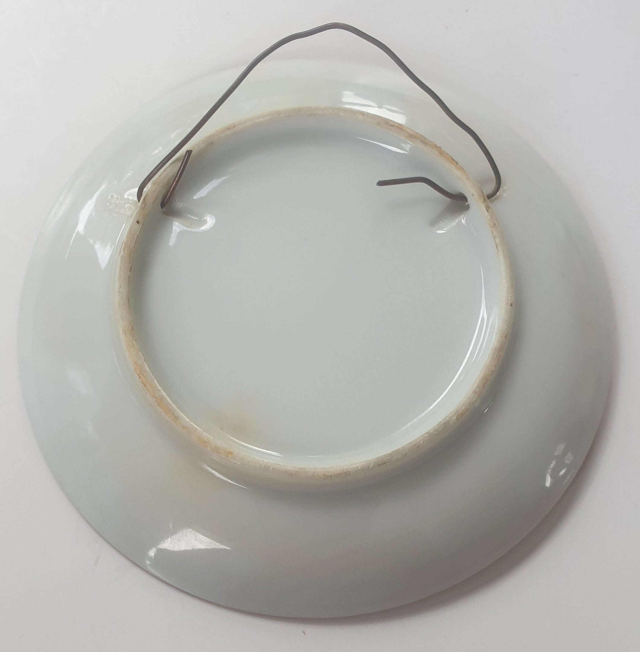 This small porcelain plate has a wire on the back to hang on a wall or can be used as a trinket or pin dish.  There is a thin gold rim around the outside. A very cool piece for your gallery wall.