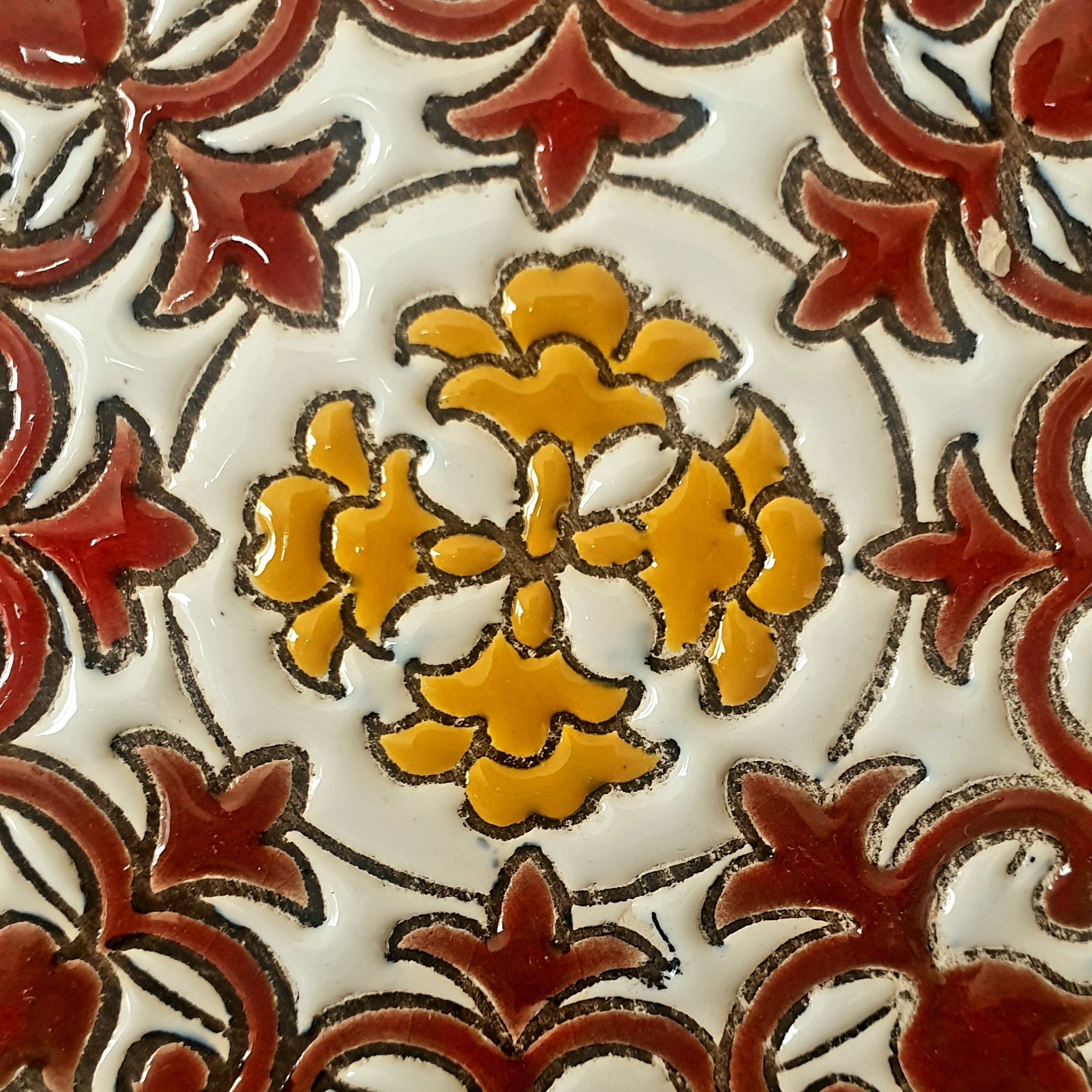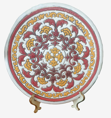 A beautiful vintage glazed hand-painted plate, most likely from Spain and circa 1970s. Lovely earthy tones of golden yellow, maroon, brown and terracotta on white.