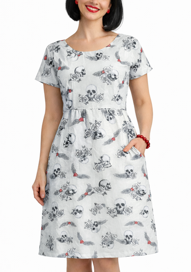 Don't play it safe - make a statement in our Skulls & Wings Audrey Dress! Designed and made in New Zealand using a classic 1950s Audrey-style sewing pattern. This vintage-inspired silhouette blends timeless design with everyday comfort, featuring two functional side pockets and a flattering fit across a wide range of body shapes. Finished in an all-over print. A distinctive dress designed for year-round wear.