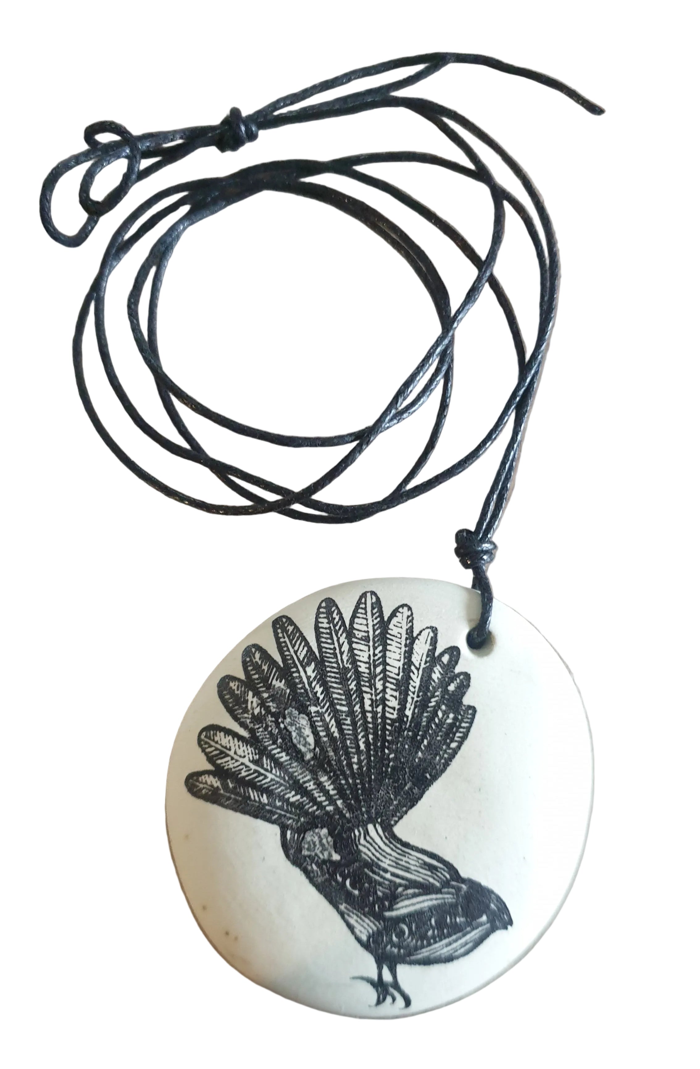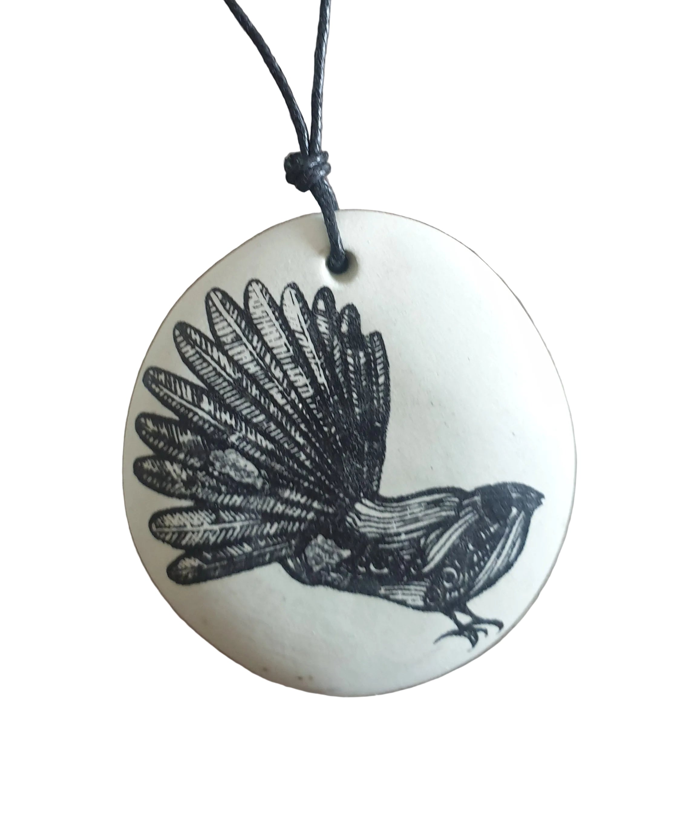 This Fantail (piwakawaka) necklace features a detailed black illustration on a smooth white round pendant, finished with an adjustable tiger-tail cord for easy everyday wear. Lightweight and easy to style, it’s a simple statement piece that pairs effortlessly with casual outfits.