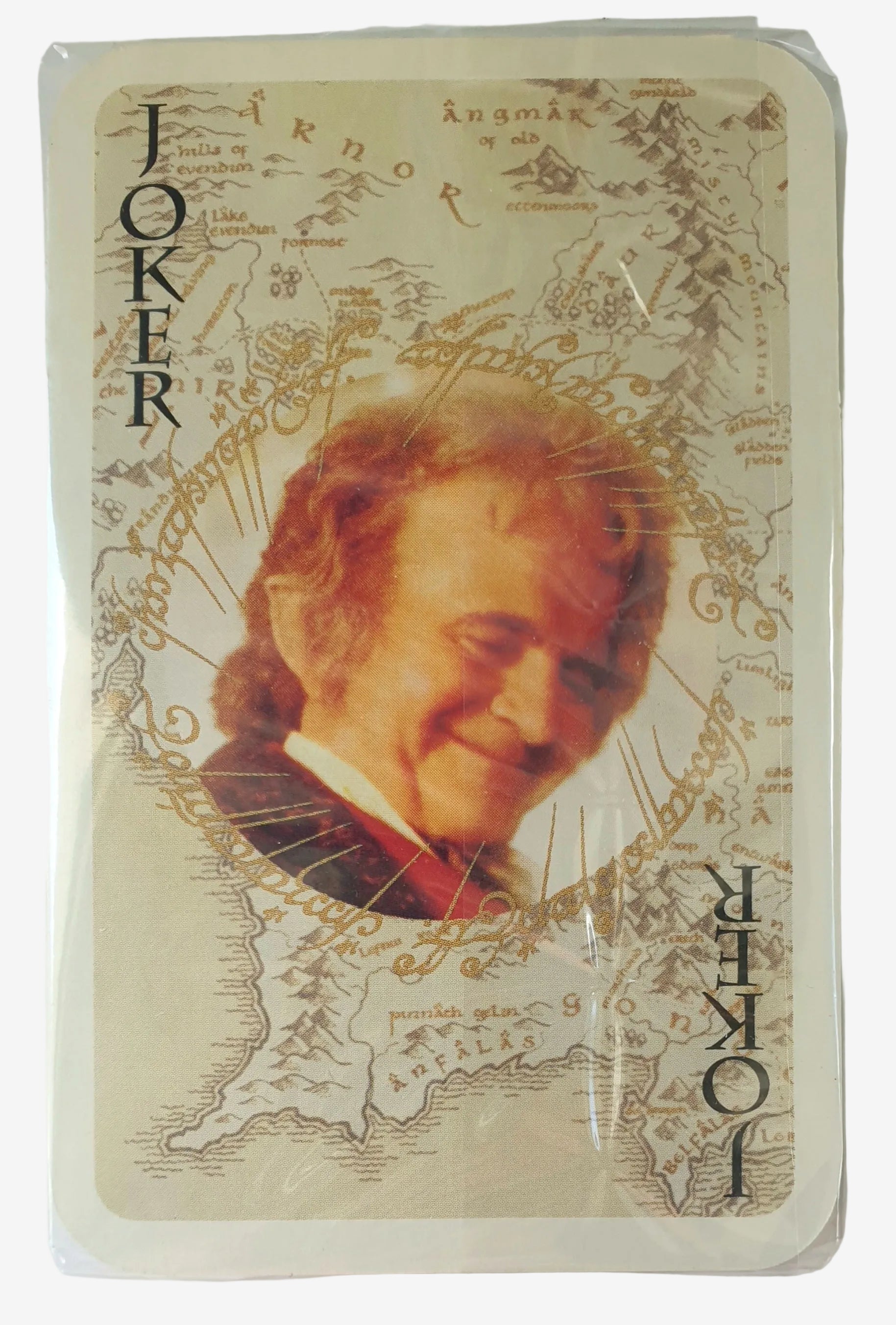 Produced as part of a limited New Zealand promotion, this standard 52-card deck features artwork inspired by the Fellowship era, with map elements from Middle-earth throughout the cards. Face cards showcase character imagery, with two Jokers included.