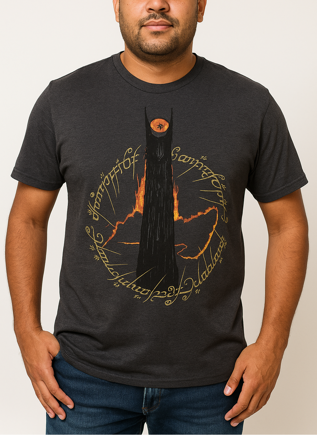 Lord of the Rings Eye of Sauron T-Shirt (4XL men's) graphic print tshirt. Charcoal grey 50% cotton / 50% polyester (has some stretch).