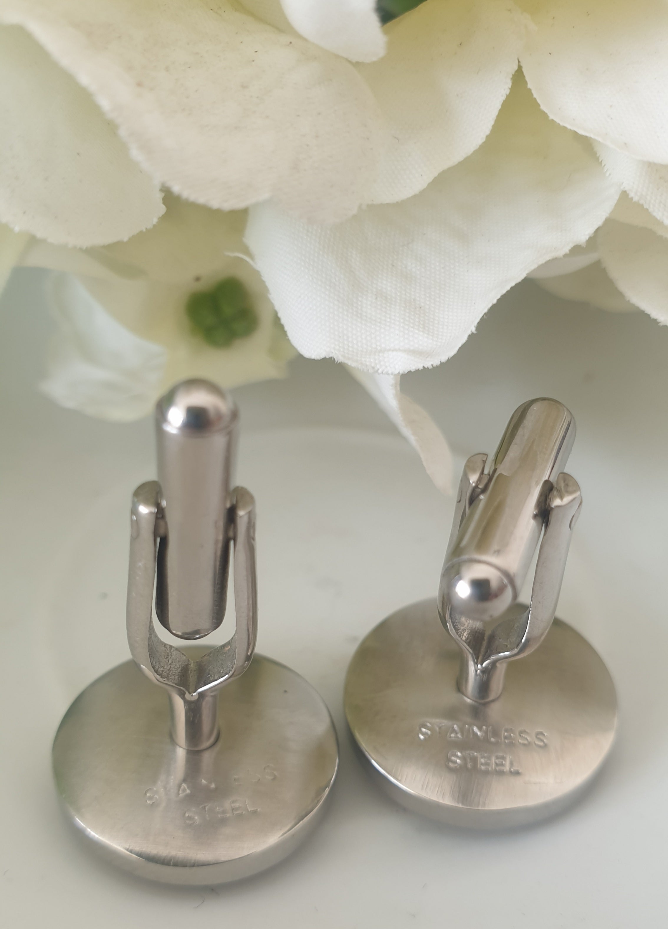 These cufflinks are made from solid stainless steel with an engraved black epoxy resin which is very strong and will not fade or tarnish when worn. Approx 1.8cm.