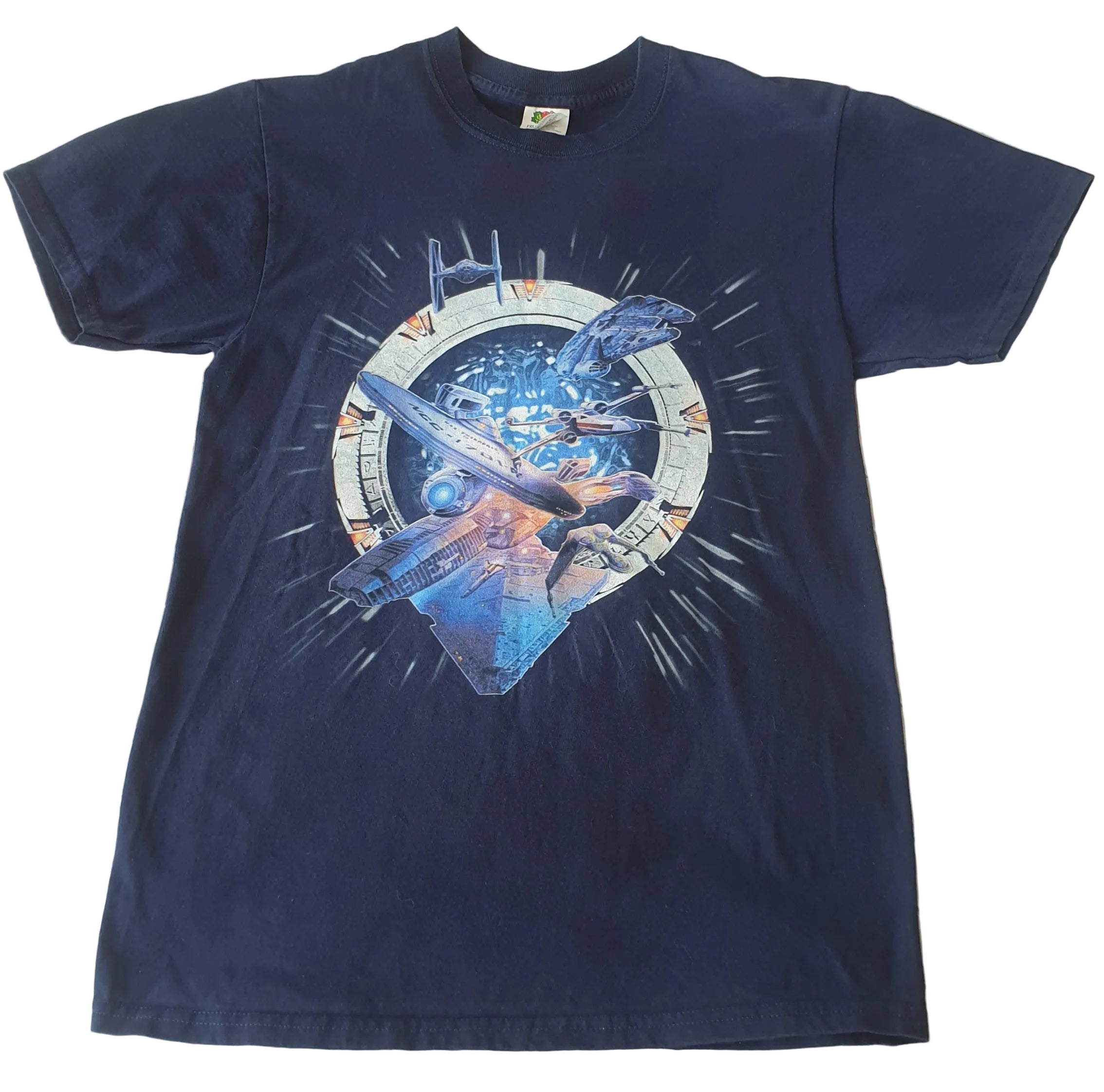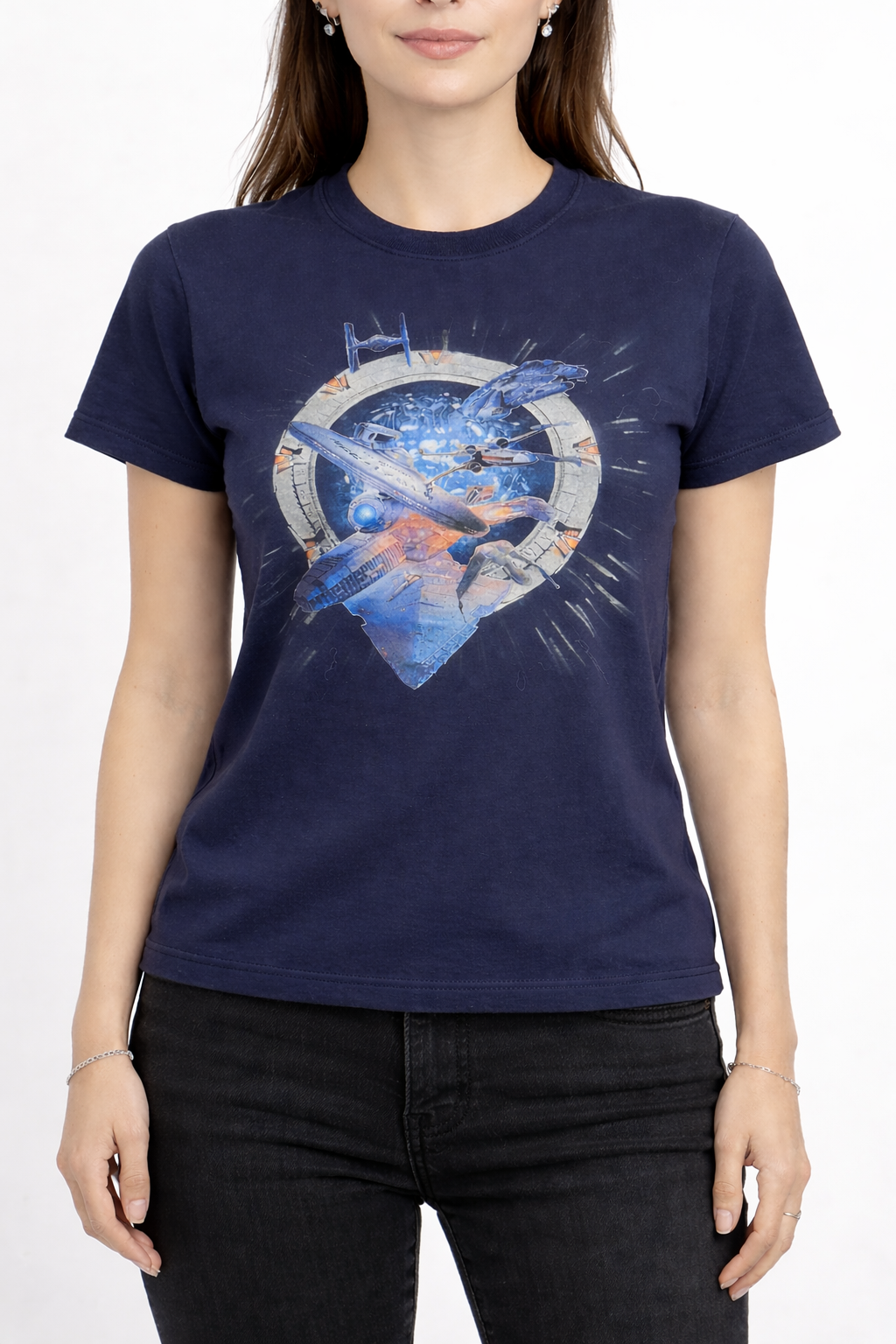 Vintage sci-fi graphic T-shirt featuring multiple iconic spaceships emerging from a Stargate-style portal. A standout crossover design with huge appeal for science-fiction fans.
