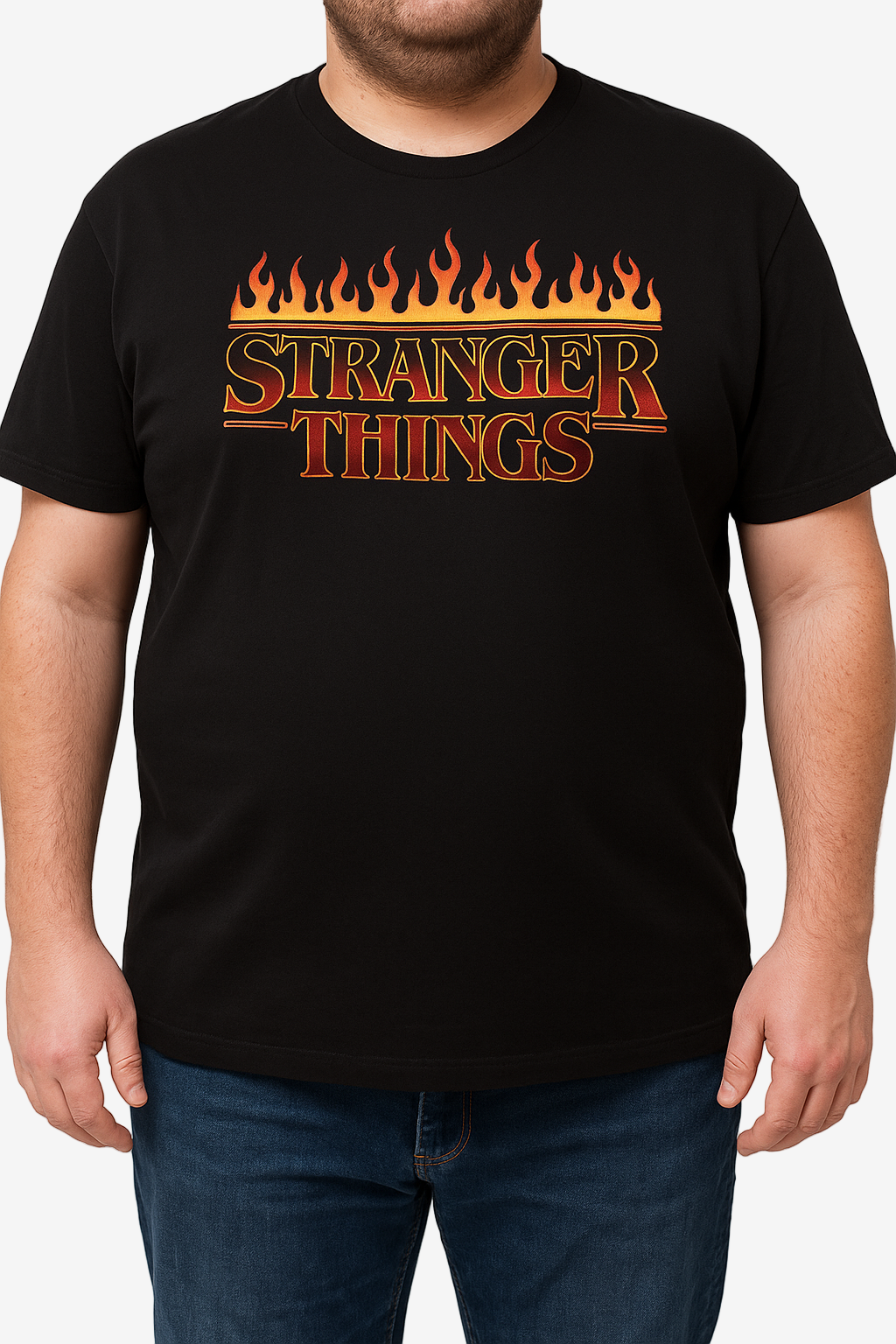 Black tee with fiery Stanger Things logo graphic on the front, plain black back.
