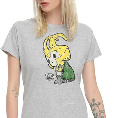 From Funko, this awesome grey cotton t-shirt shows Loki looking over his shoulder Pop! Vinyl style. He's always up to something! 100% Officially Licensed Merch