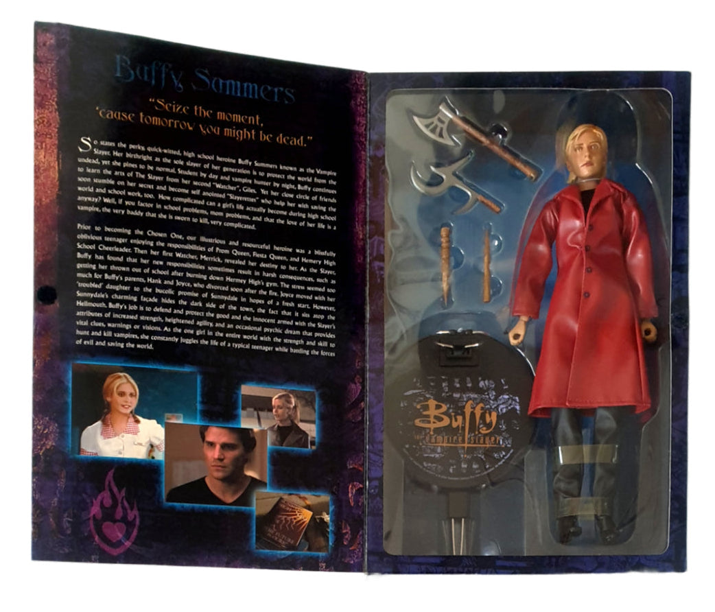 This 12″ Buffy Summers figure is boxed and complete, including the original stand and all accessories. The figure and fabric outfit present cleanly inside the packaging.