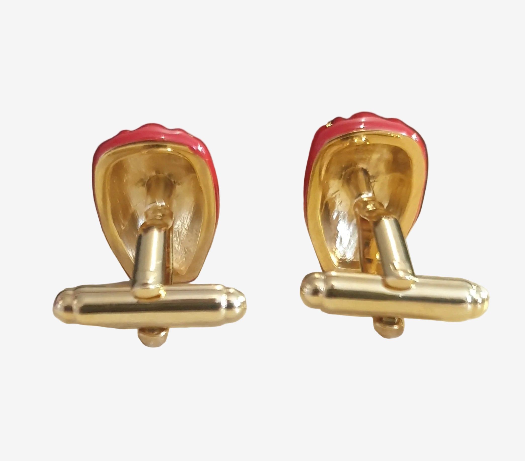 Iron Man cufflinks featuring the iconic red and gold helmet in vibrant enamel with golden metal settings. Perfect for Marvel fans who want to add superhero style to any outfit.
