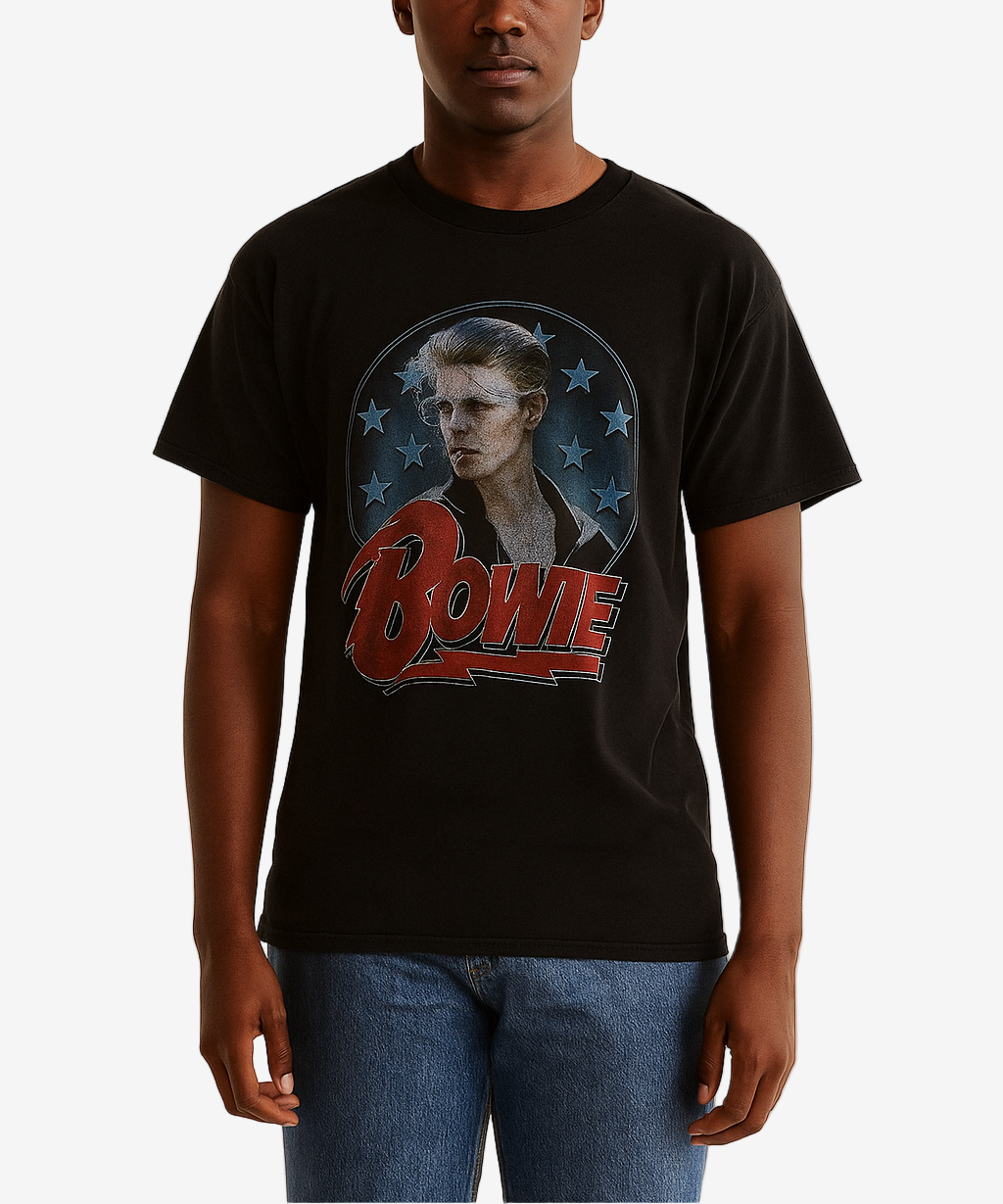 Men's David Bowie black stars tee. This is a men's cut tshirt in washed black colour.