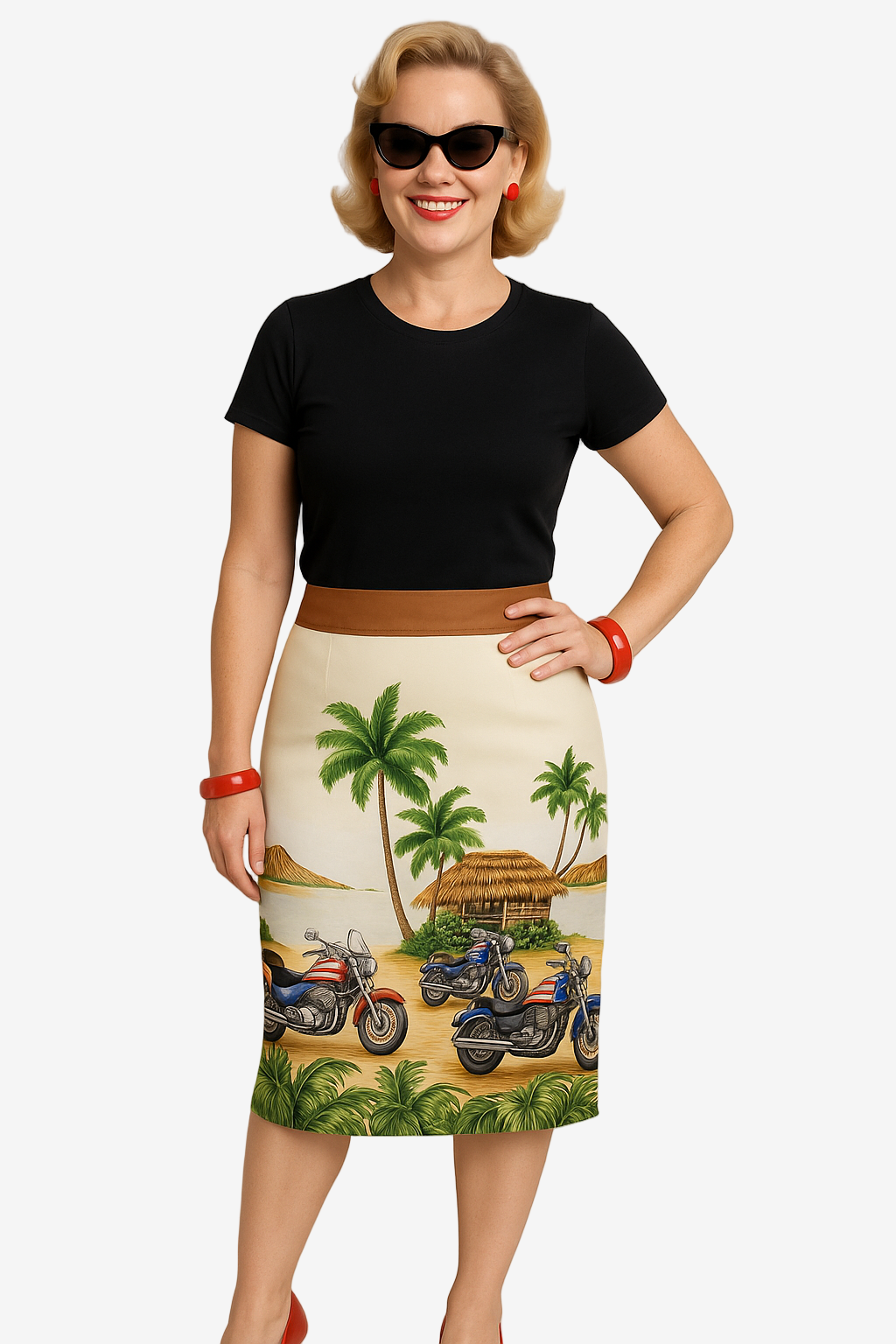 Get ready to ride in style with our Easy Rider Skirt. This skirt features a playful print of Americana motorbikes and palm trees, perfect for a trip to the Tiki bar. Available in Small and Medium, it's the perfect addition to your quirky wardrobe. Gear up for a fun and fashionable adventure! Printed fabric on the front, plain tan waist and back fabric. There is a back pocket too.