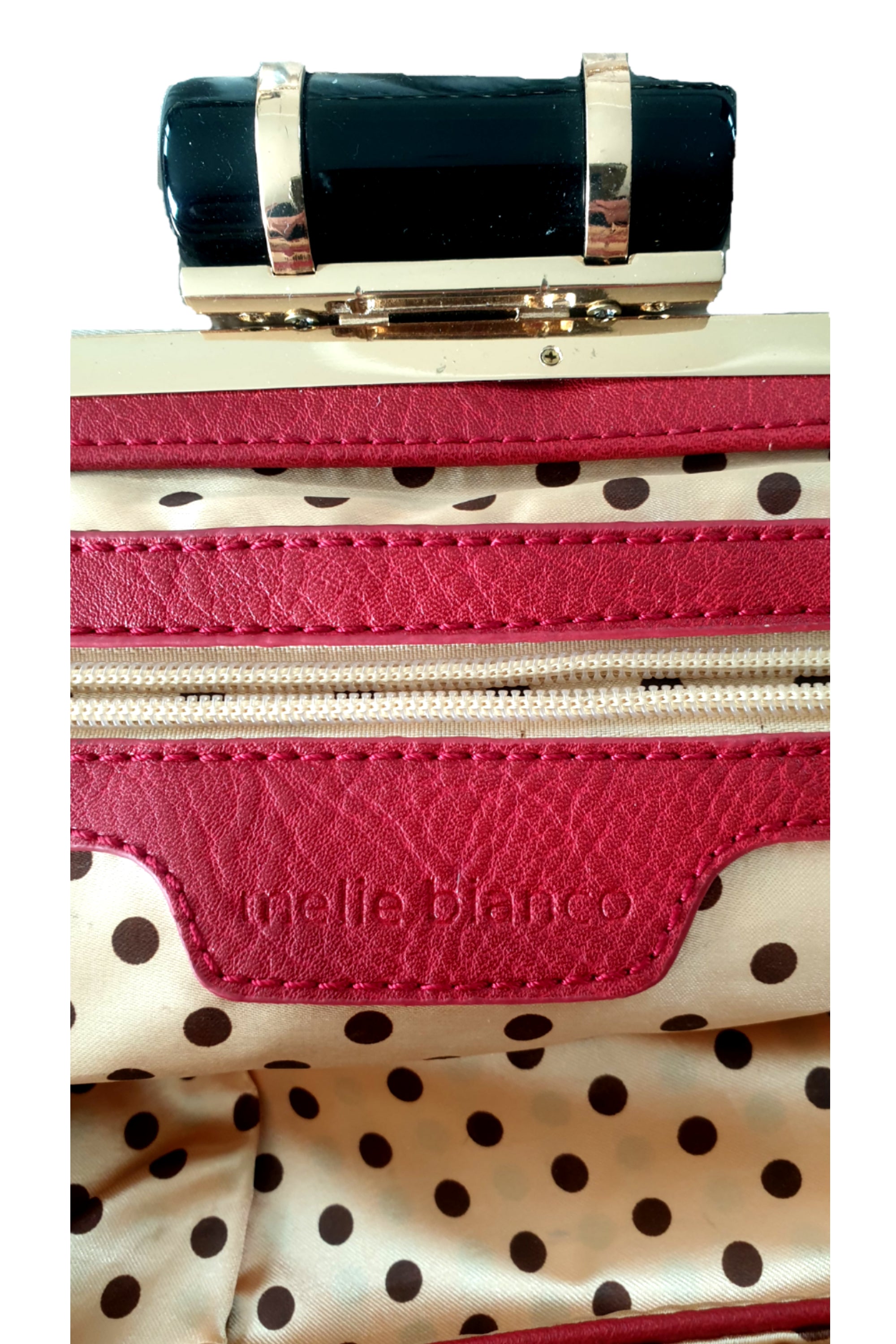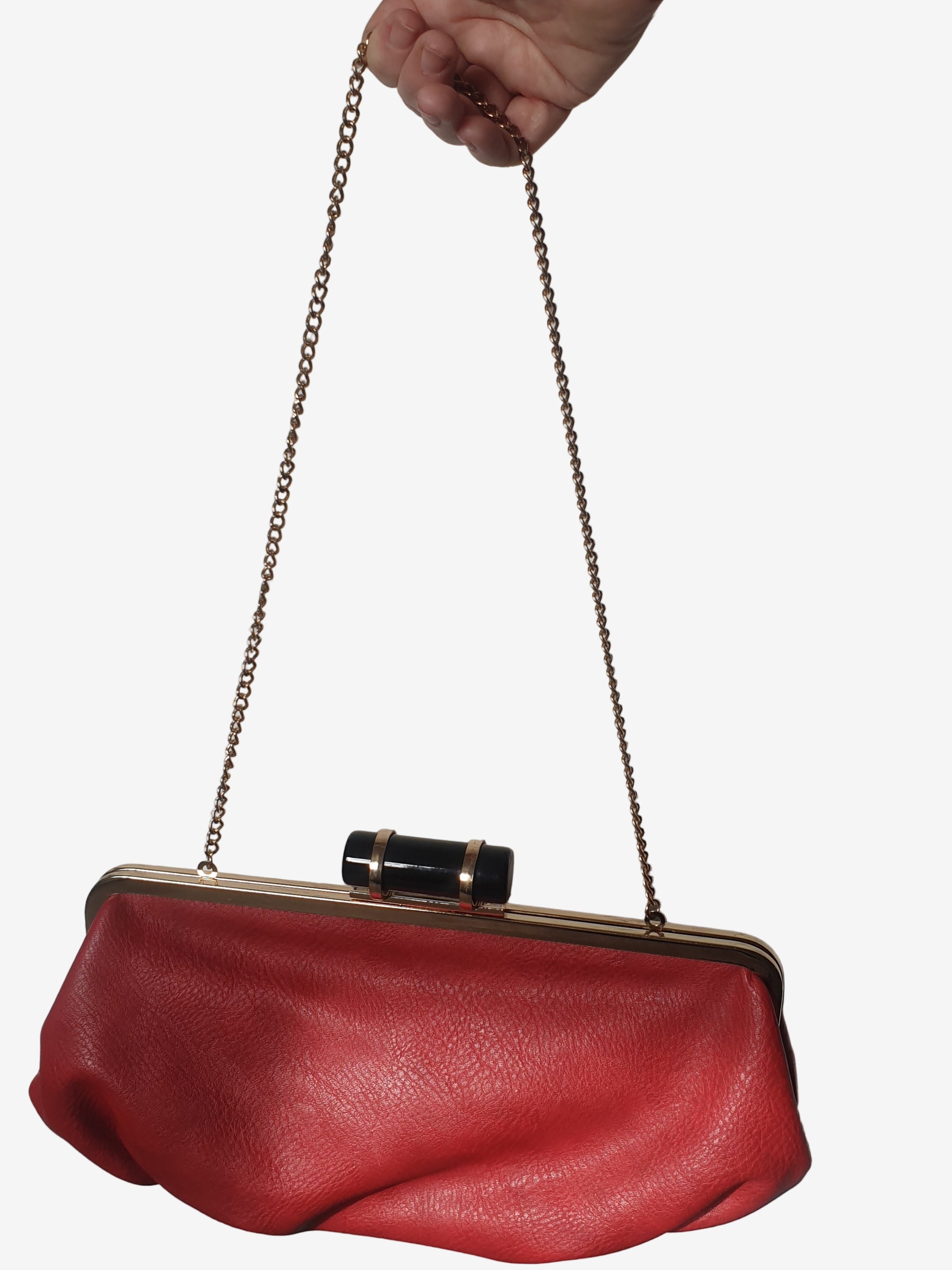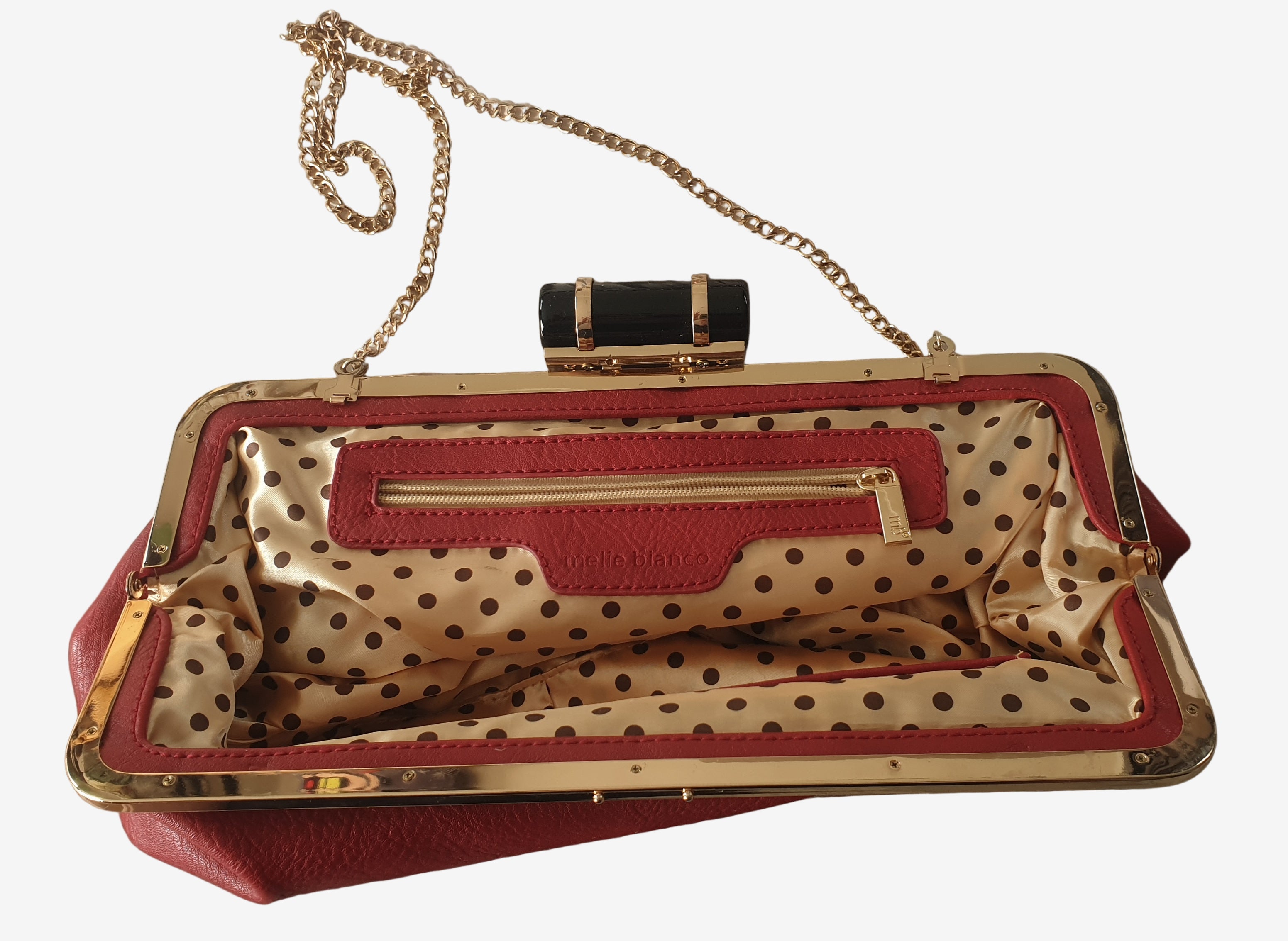 Step into the spotlight with this stunning red handbag that screams retro glamour. Featuring a chic polka dot-lined interior, it's packed with practical storageāa spacious main compartment, zippered pocket, and two additional sections to keep your essentials organised. The showstopper? A fabulous gold chain shoulder strap paired with a sturdy magnetic clasp and rich brown handle that channels authentic 80s sophistication. With its smooth vintage aesthetic and bakelite-inspired details, this beauty is your ticket to timeless style.
