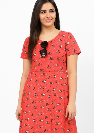 Look stylishly retro with this Planet Retro Original red Mickey Mouse Audrey Dress! 100% cotton featuring a playful all over Mickey pattern and musical notes. Classic 50s fit and flare style, you’ll feel magical and care-free all day long. Be sure to channel your inner vintage queen in this striking red dress!