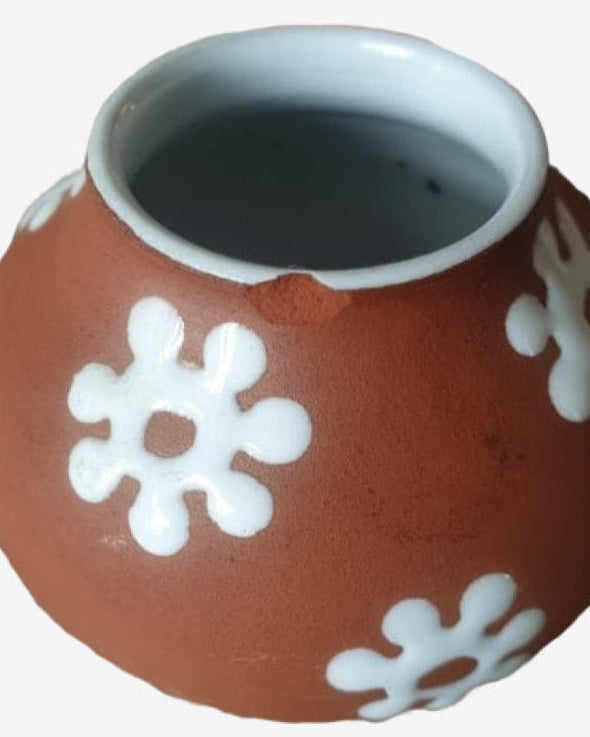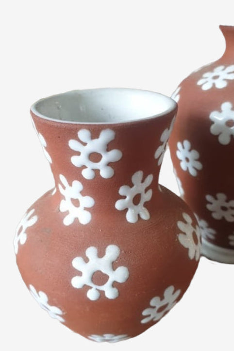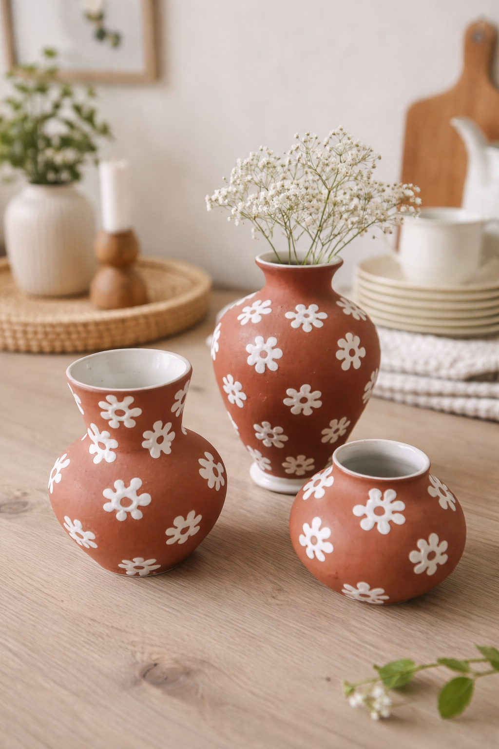 A coordinated trio of mid-century Danish pottery vases by Lüthen Keramik, dating to the 1960s. Finished in warm terracotta with applied white floral motifs, these pieces showcase classic Scandinavian studio pottery forms designed to be displayed together.