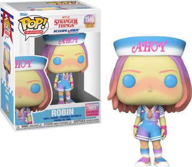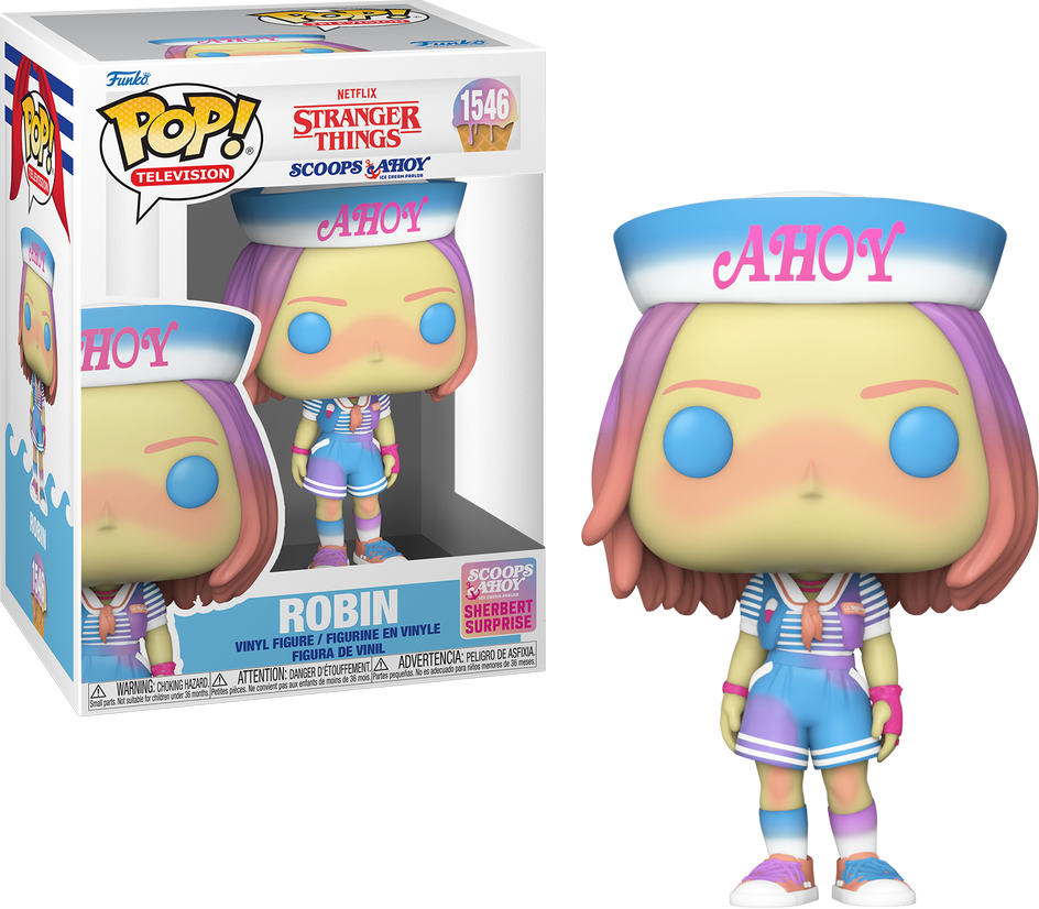 Funko Pop Vinyl figure Stranger Things, Robin Scoops Ahoy Sherbert Surprise #1546, a 2024 release collectable.  This Pop! features Robin in the Scoops Ahoy signature flavour Sherbert Surprise colour palette. This item is brand new.