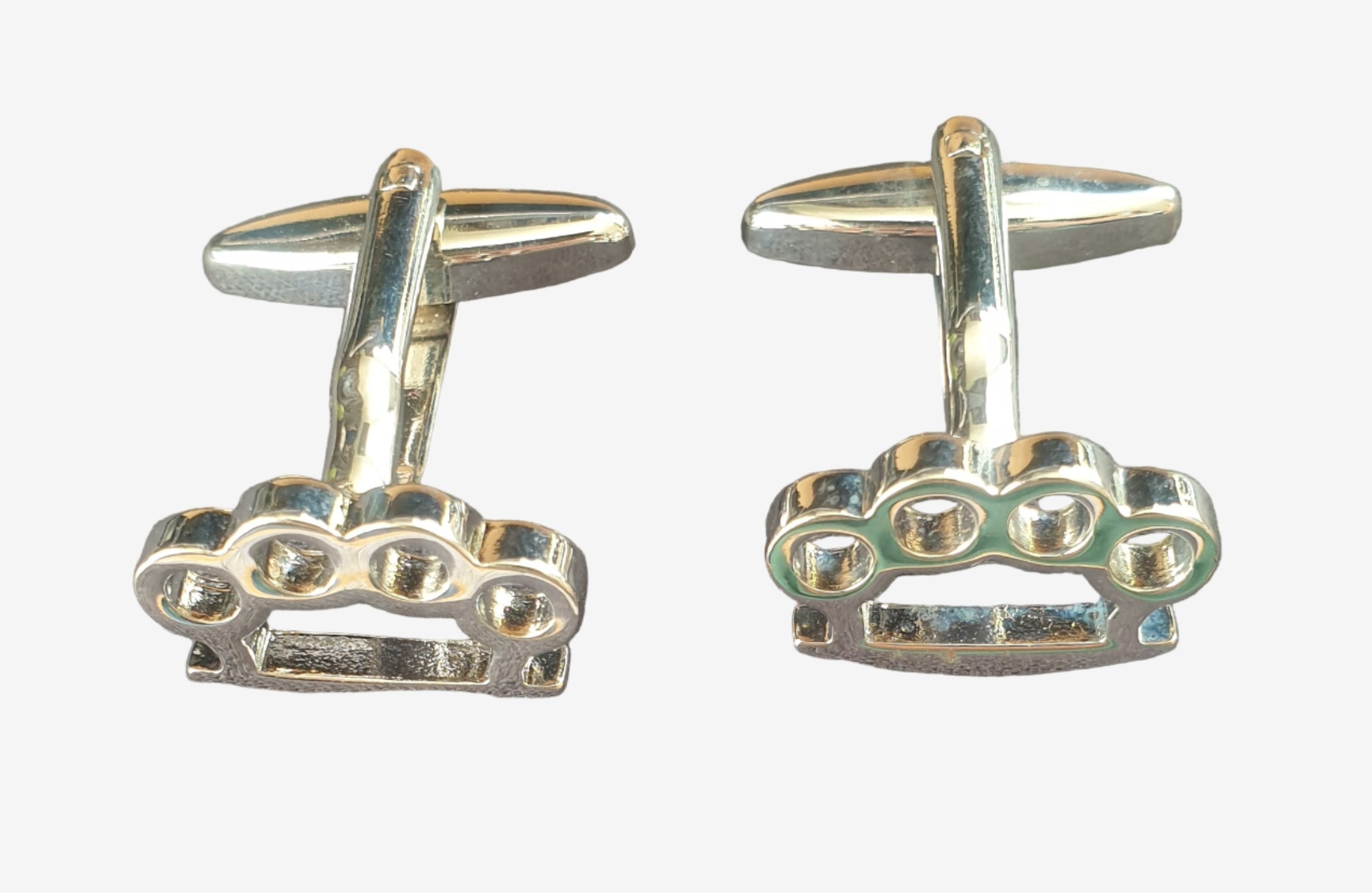 Throw a punch of personality into your formal wear with these silver metal Knuckle Duster cufflinks. Perfect for the collector who refuses to play it safe, these edgy accessories transform any suit or dress shirt into a statement piece. Ideal for weddings, parties, or whenever you want to add a touch of rebellious charm to your ensemble.Â