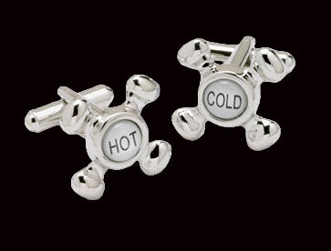 Fun tap hardware silvertone cufflinks. Are you running HOT or COLD? A playful yet discreet accessory, perfect for any event.