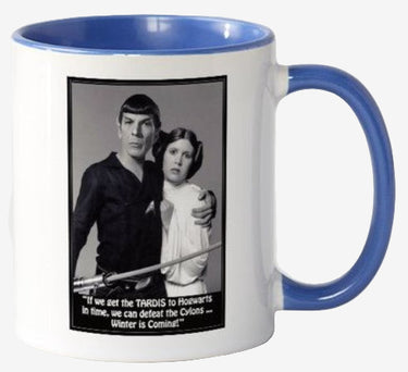 Your new favourite mug. Wording reads 'If we get the TARDIS to Hogwarts in time, we can defeat the Cylons. Winter is coming!'.