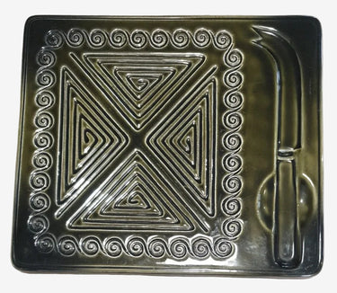 Finished in a rich olive-green glaze, this rectangular board features bold geometric relief and an integrated knife rest — a striking example of Sylvac’s move toward more modern, design-led tableware during the mid-century period.