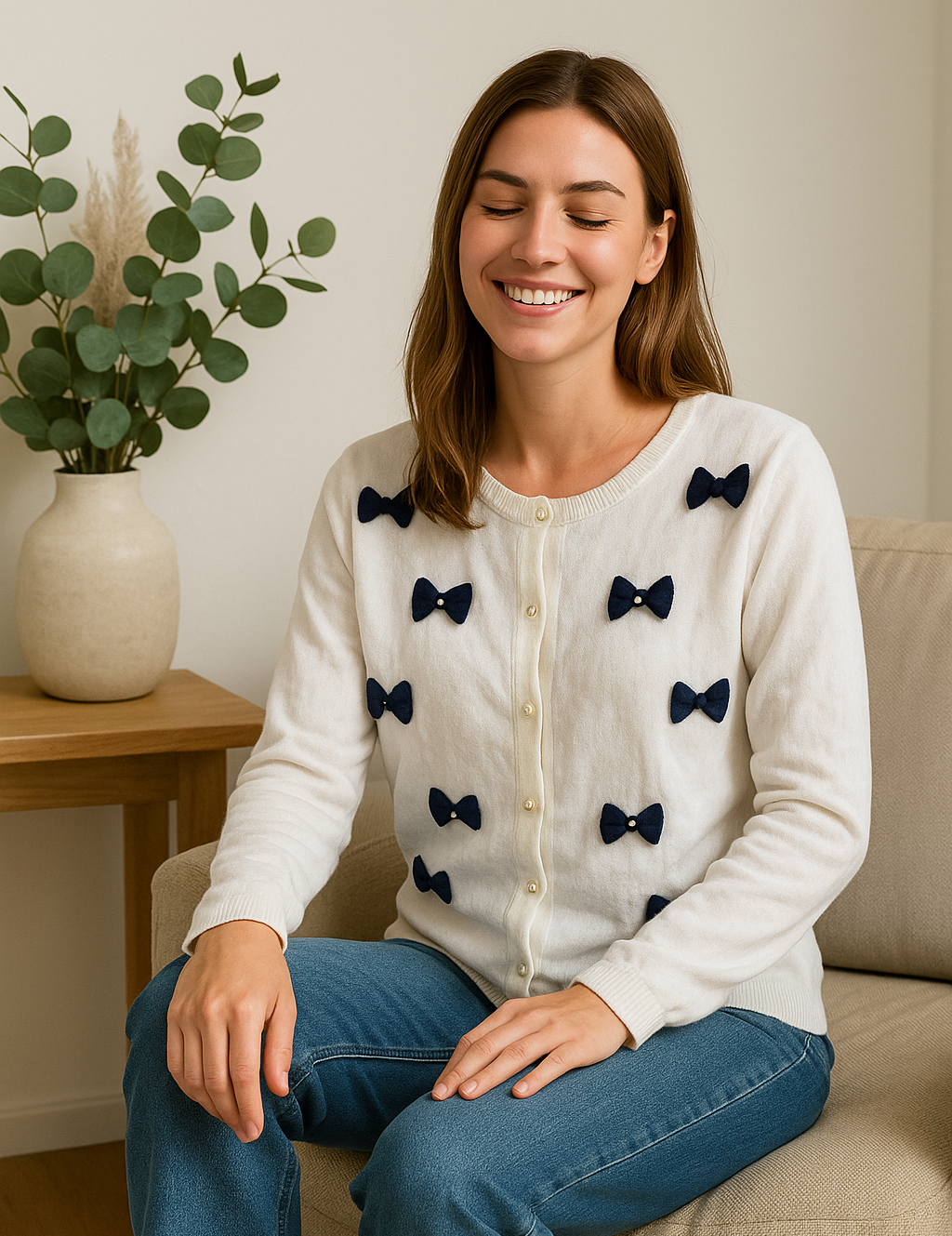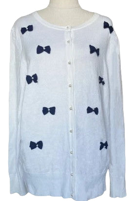 Here's a preppy little number to team with your swing skirts or cigarette jeans! White stretchy cardi with pretty black bows and faux pearl buttons. Plain back.
