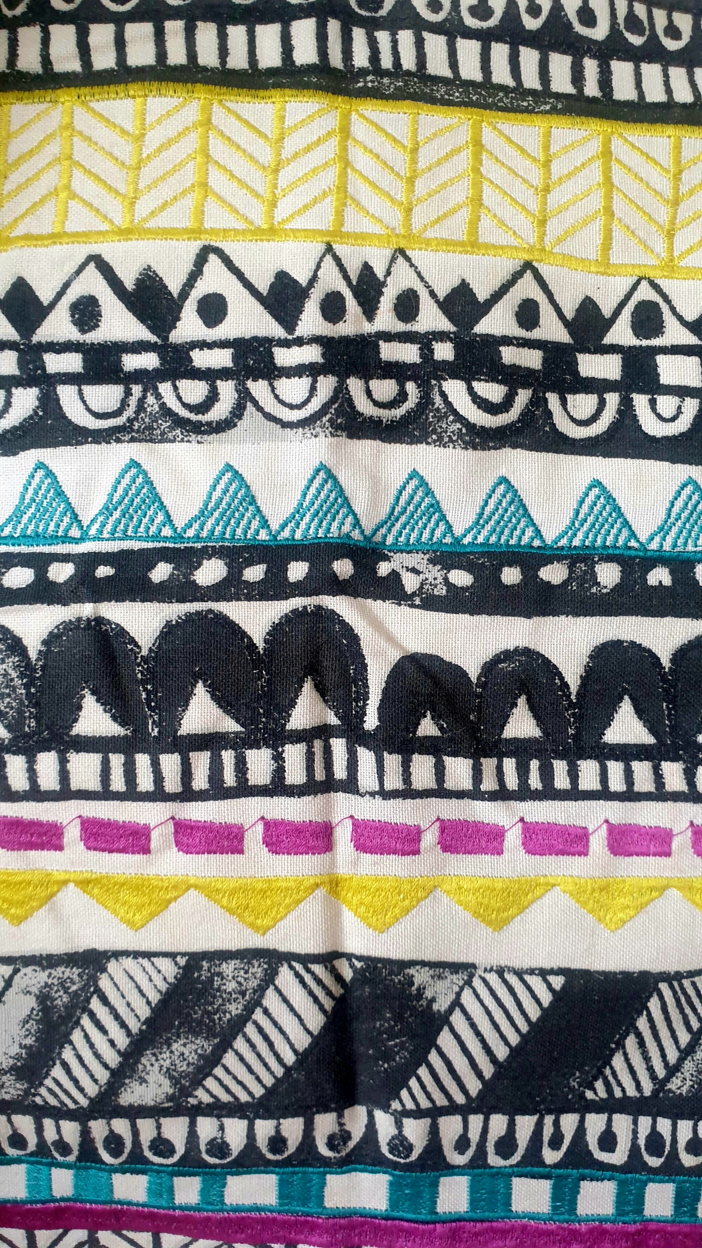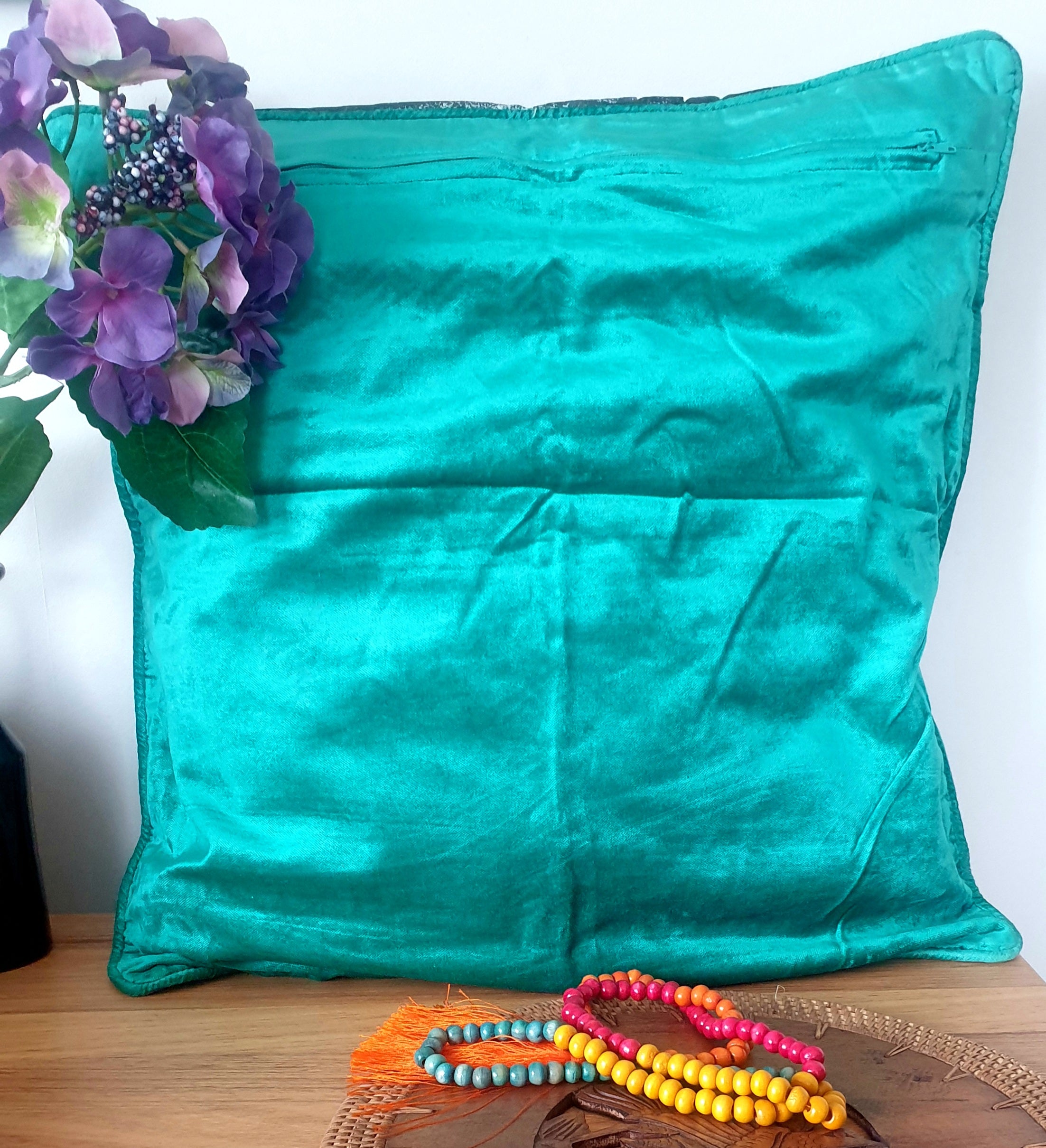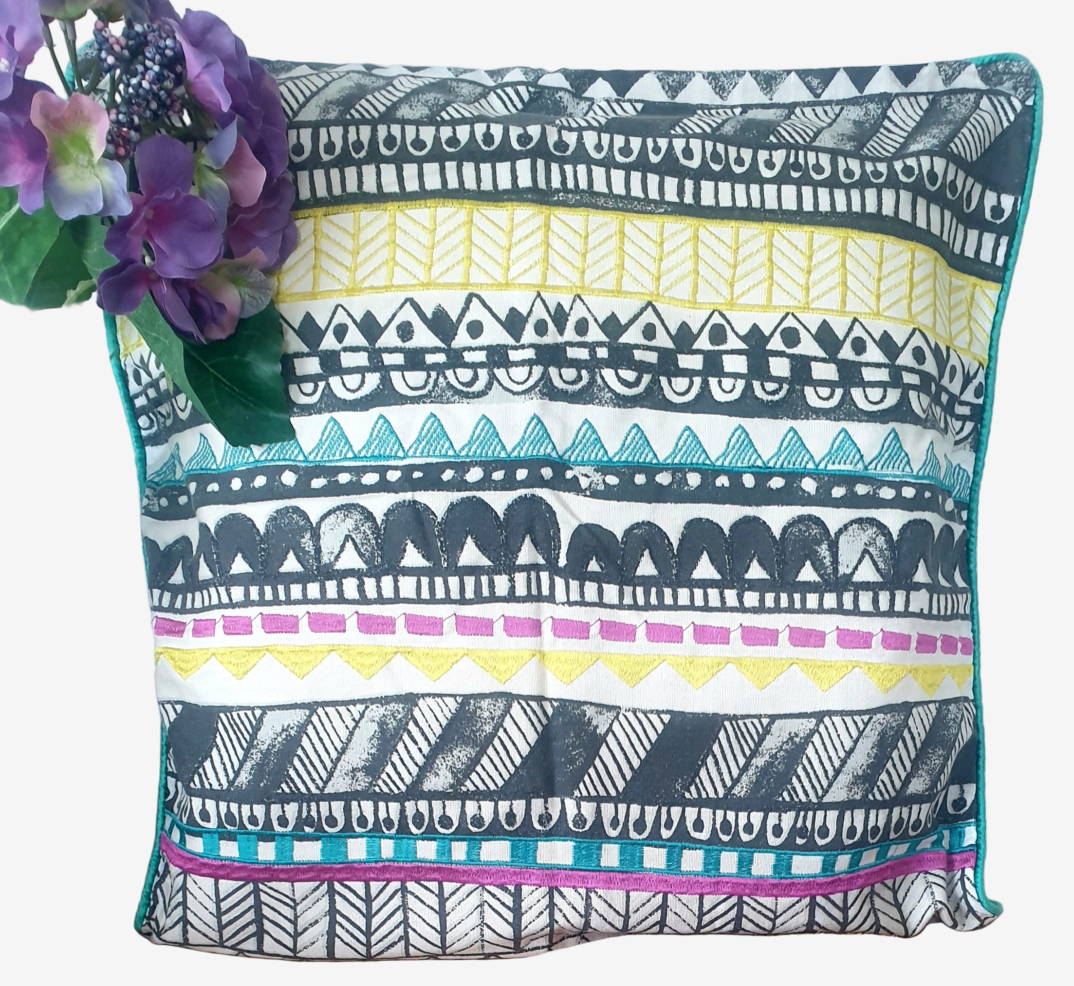 Approx 45cm square.  Pretty print on the front in fuschia purple, lemon yellow, black white and green.  The back is the same green as the piping around the outside of the cushion cover.  Fabric on the back is a lovely soft velvet.  There's a back zipper as well to allow for easy removal of an inner.  Nice tiki bar stylings.