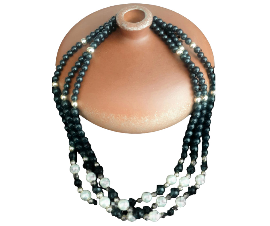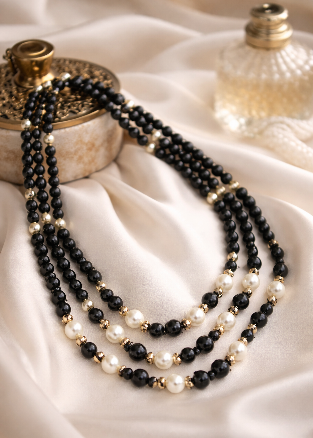 A striking vintage necklace with elegant Breakfast at Tiffany’s–inspired style. Three strands join at the back of the neck before sitting beautifully across the front in a layered crossover design.