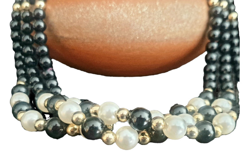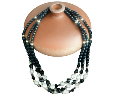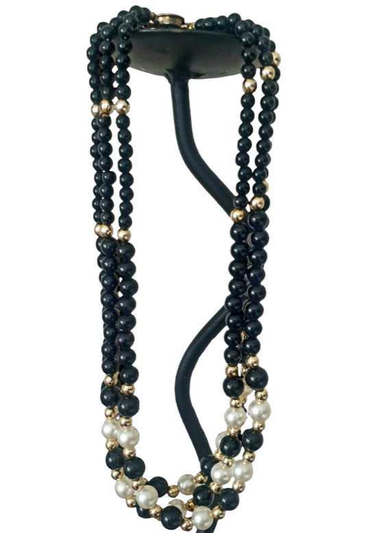 Faux pearls are paired with black and gold-tone round beads to create a classic mid-century look with a touch of glamour. Despite the bold appearance, the necklace is lightweight and comfortable to wear.