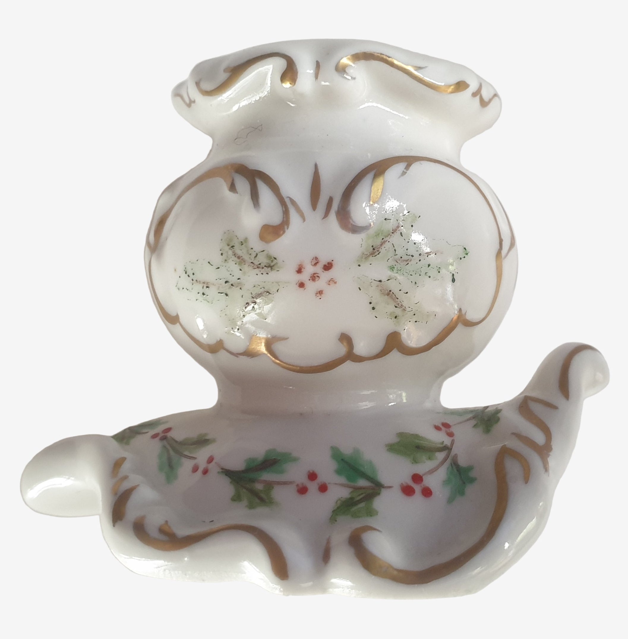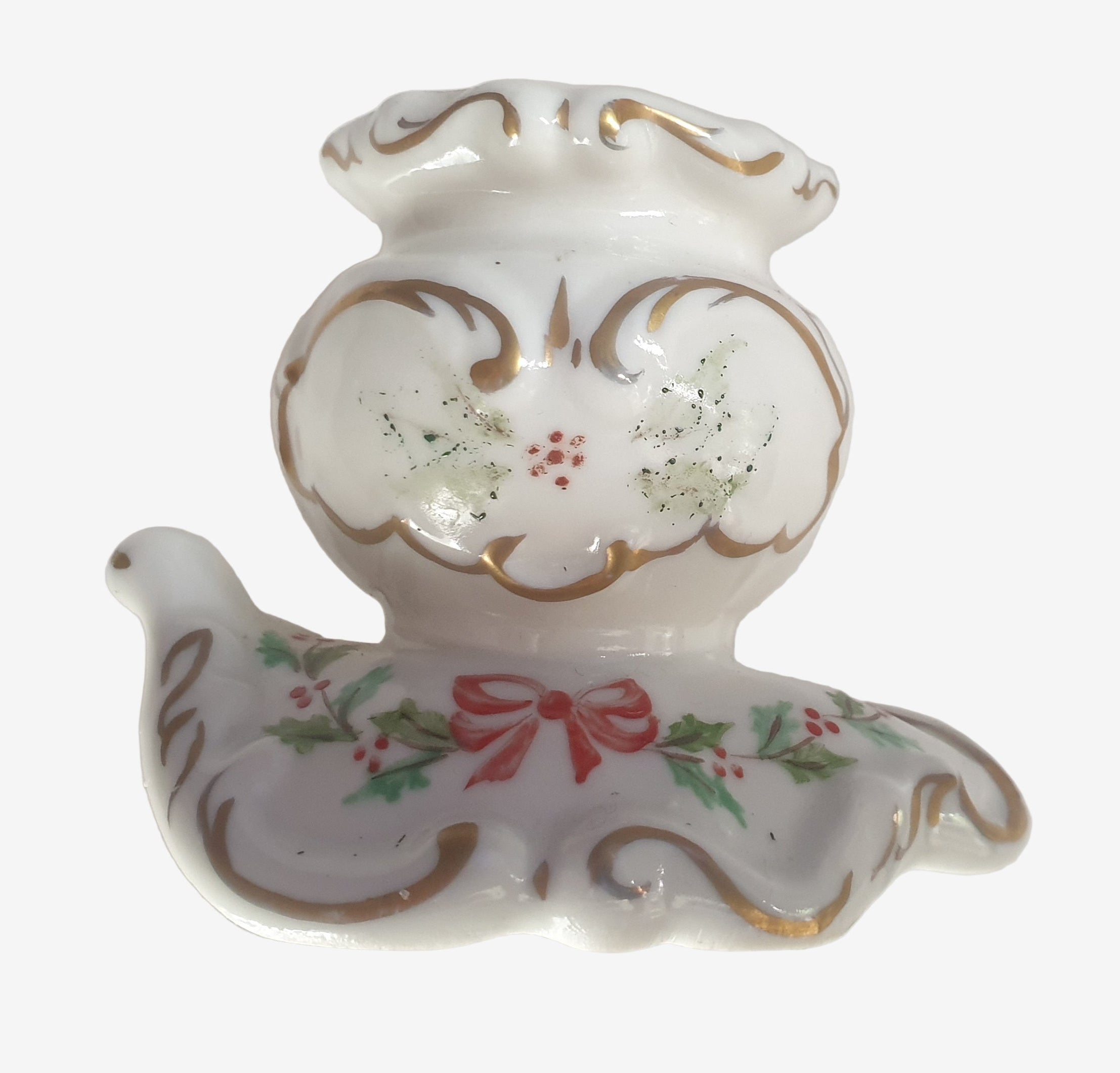 Good condition, no chips or cracks but the hand-painted imagery has worn away in places. The base is stamped Irish Dresden "Holly-Bow". A charming piece to add to your holiday and Christmas decor.