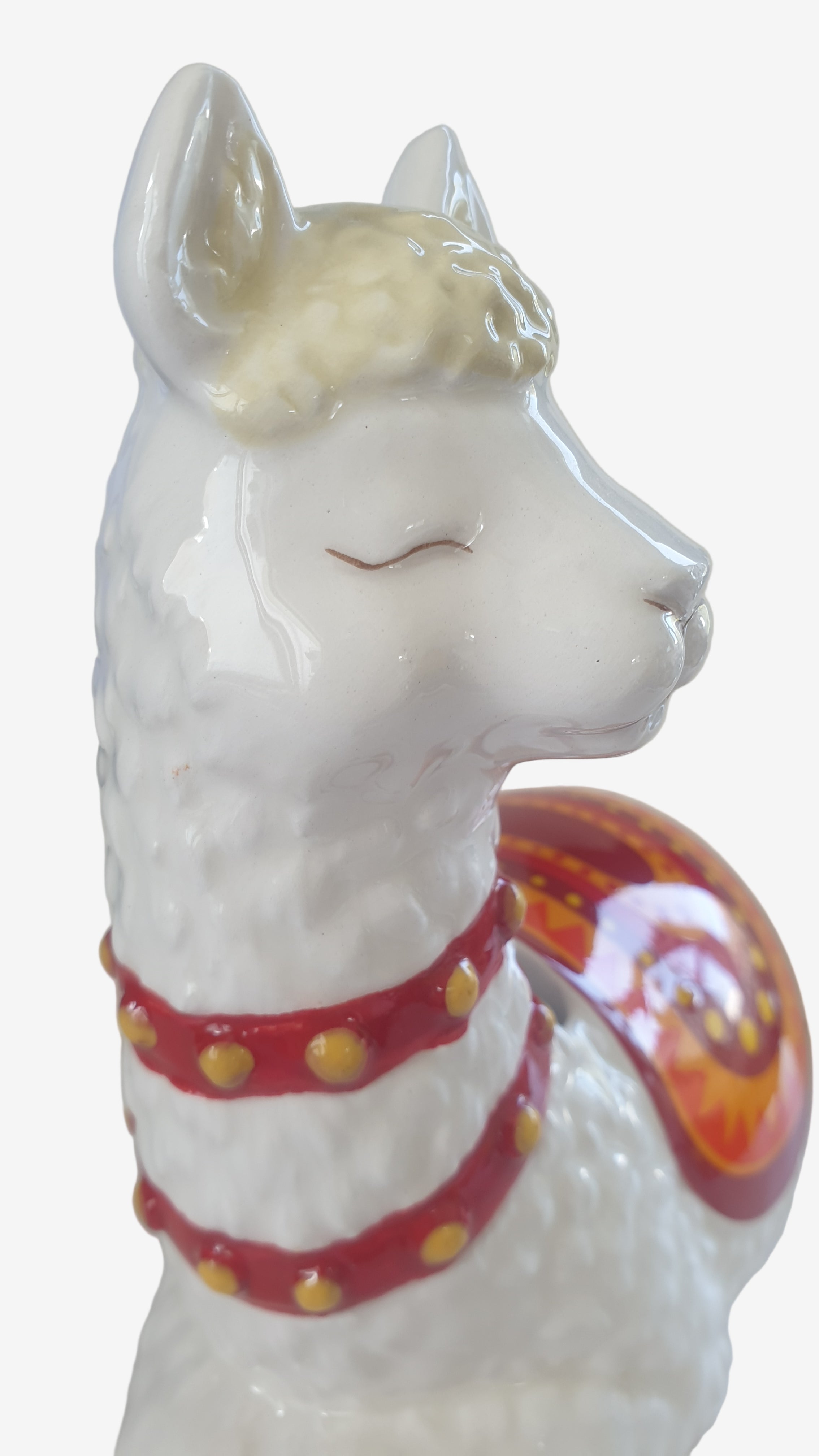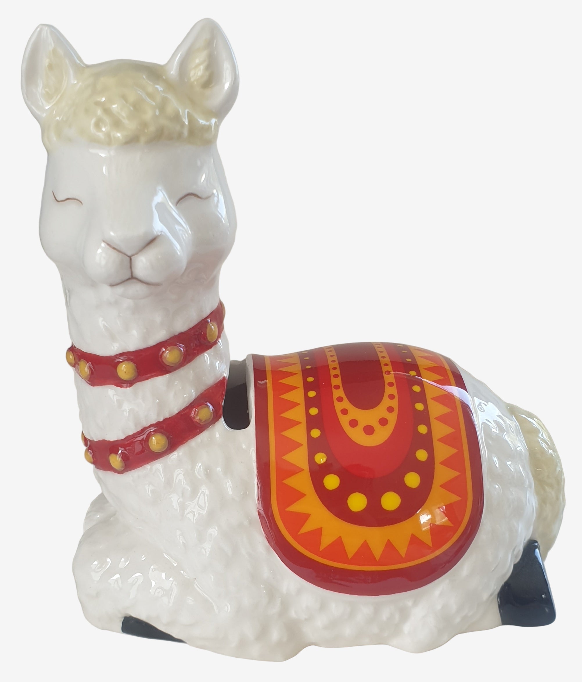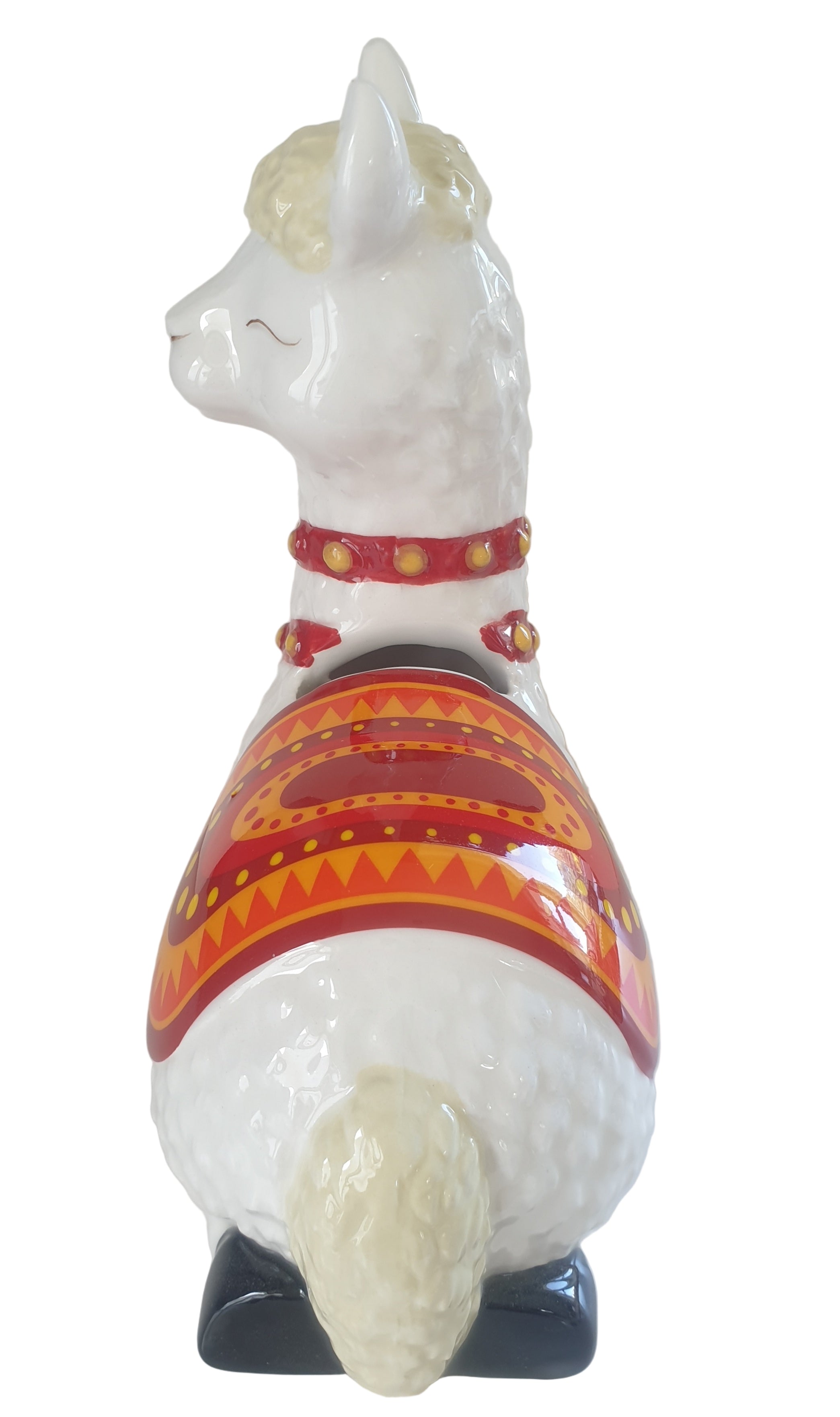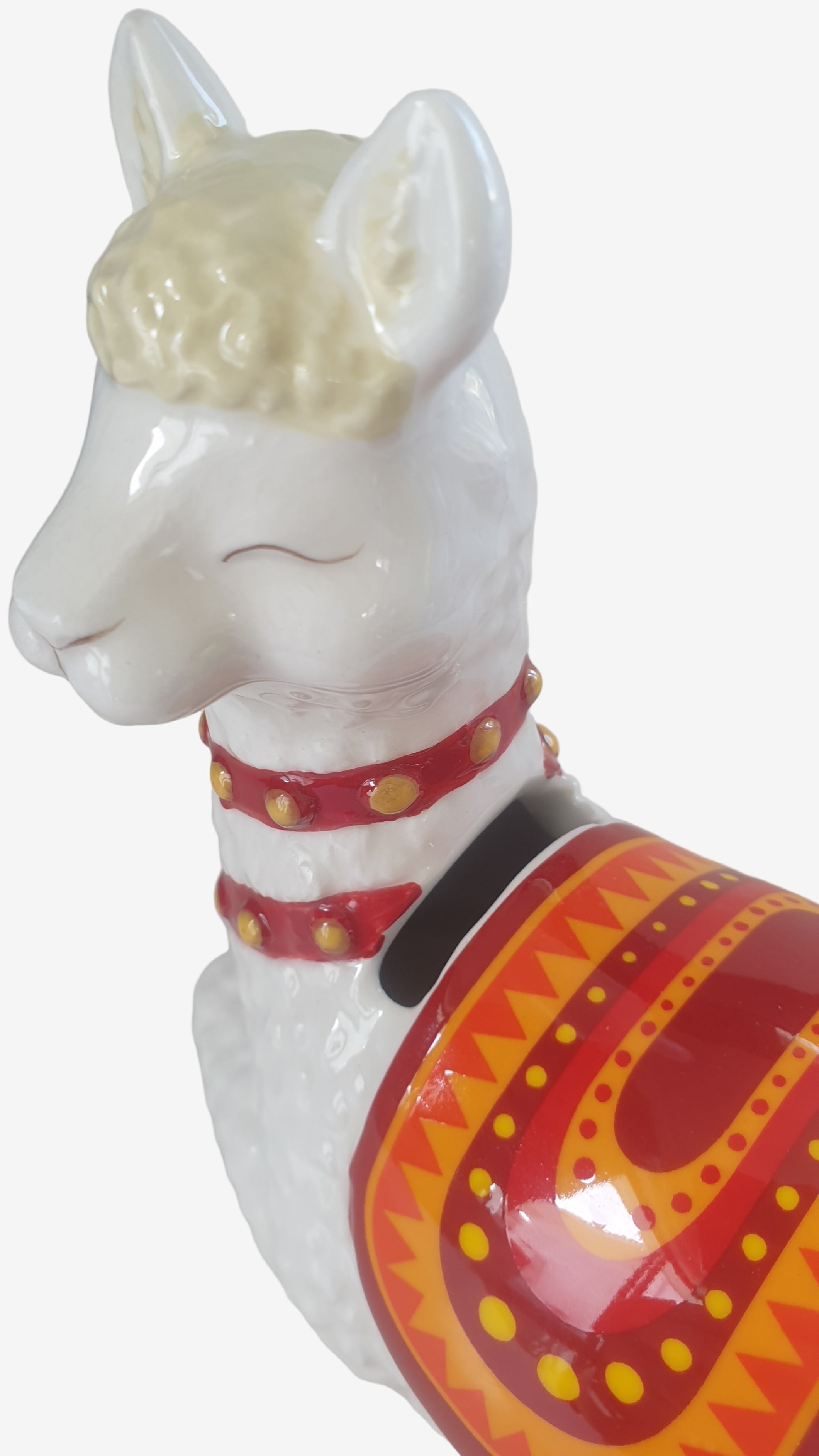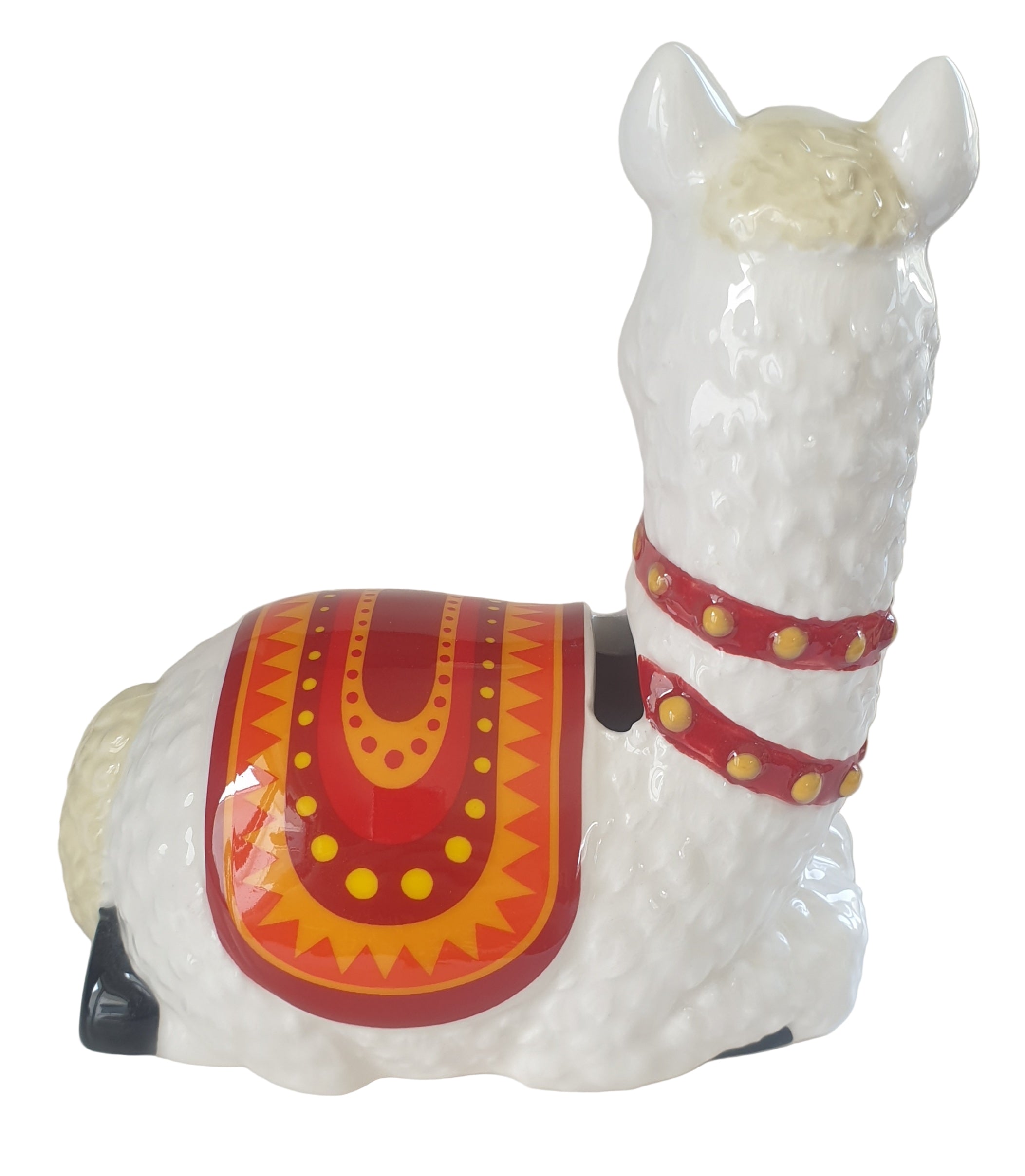 Add a touch of fun and colour to your space with this adorable ceramic alpaca money box! Featuring a glossy white finish with a bright red and yellow patterned saddle, this cheerful alpaca is perfect for saving coins or simply brightening up a shelf.