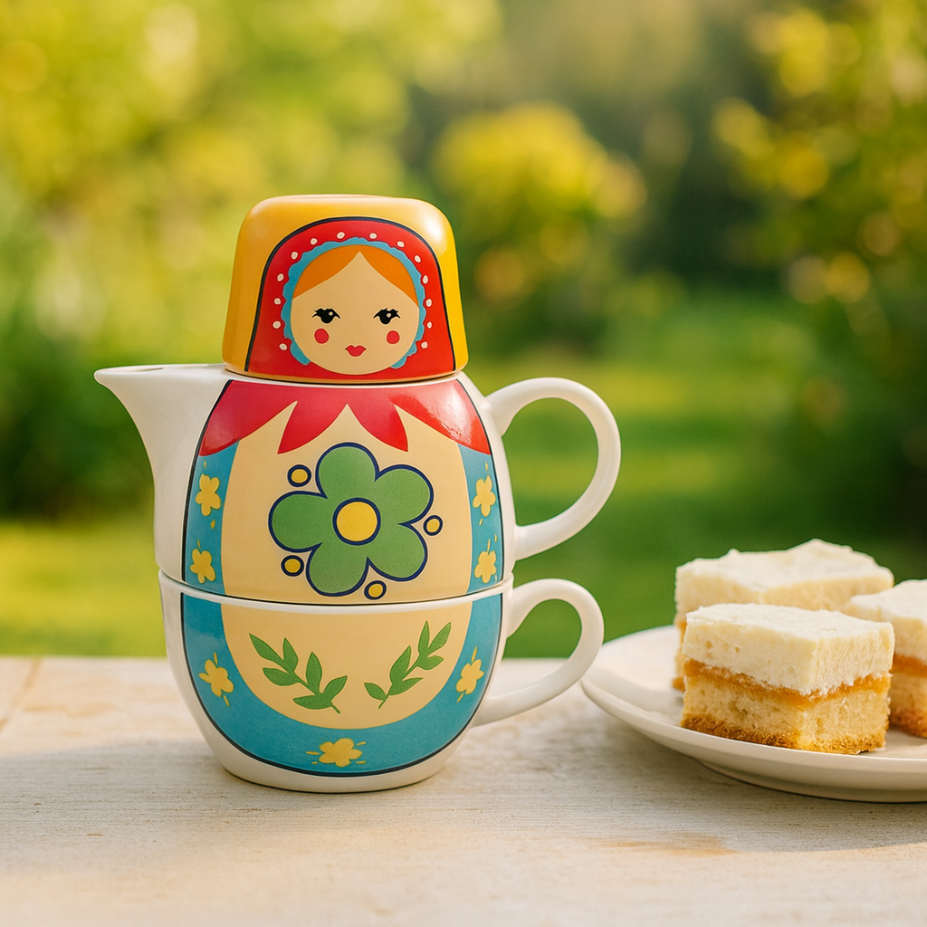 Brew up some nostalgia with this charming ceramic teapot-and-cup duo, adorned with a vibrant Babushka doll design. Perfect for solo tea moments or as a delightful gift for anyone who treasures Russian folk art and quirky kitchen companions. A whimsical addition to any teapot enthusiast's collection.