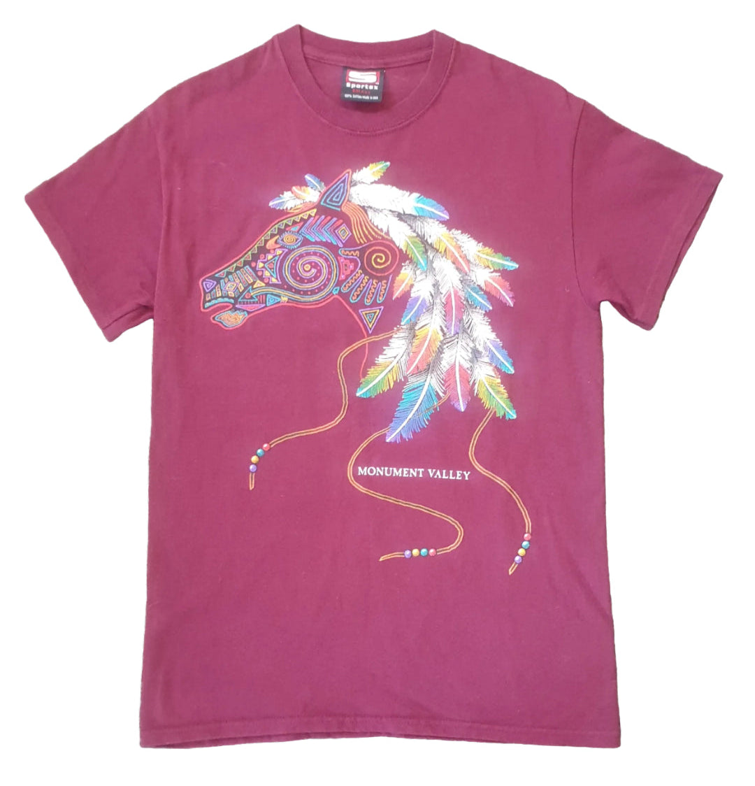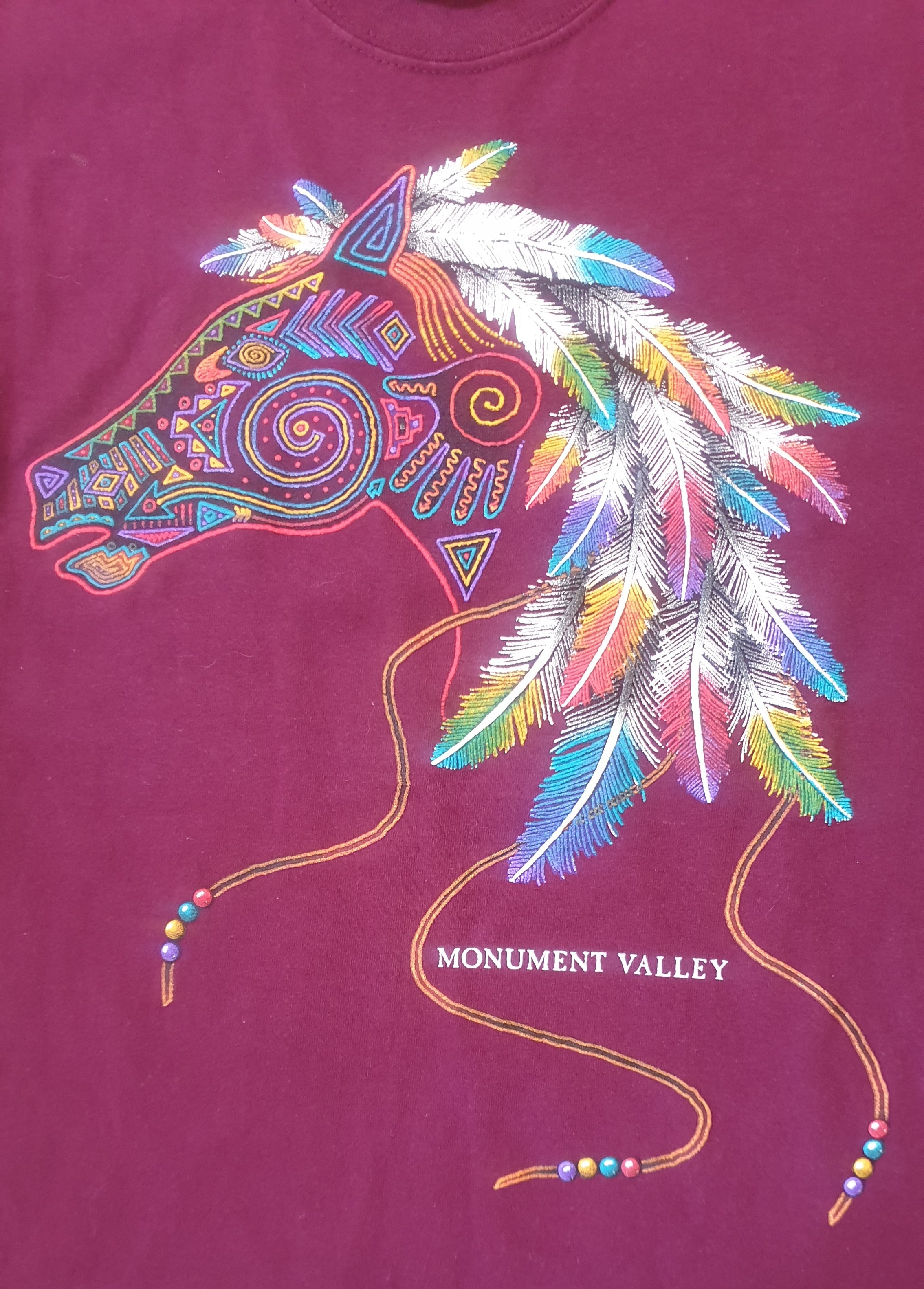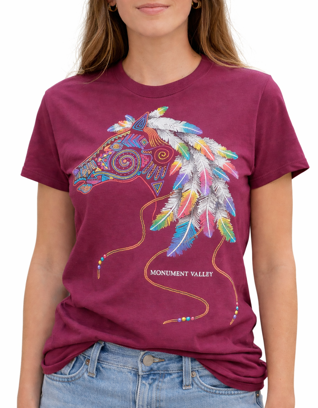 Vintage Monument Valley, Bluff Utah t-shirt. A colourful graphic women’s tee featuring a stylised horse head inspired by Southwestern artwork. The design combines geometric patterns with flowing feather details and bead accents.