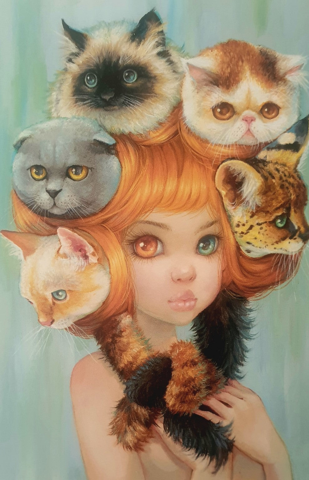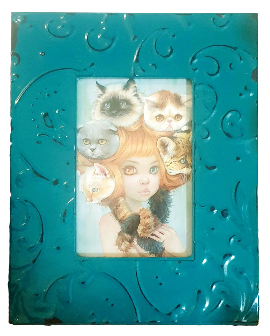 The piece shows her signature dreamy girl surrounded by cats, printed as a postcard and professionally displayed in a recycled glass 6 x 4 inch frame.