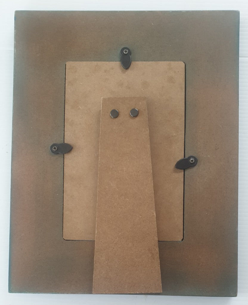 The frame has small black chips in the finish. They blend into the textured design and don’t distract from the artwork.