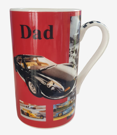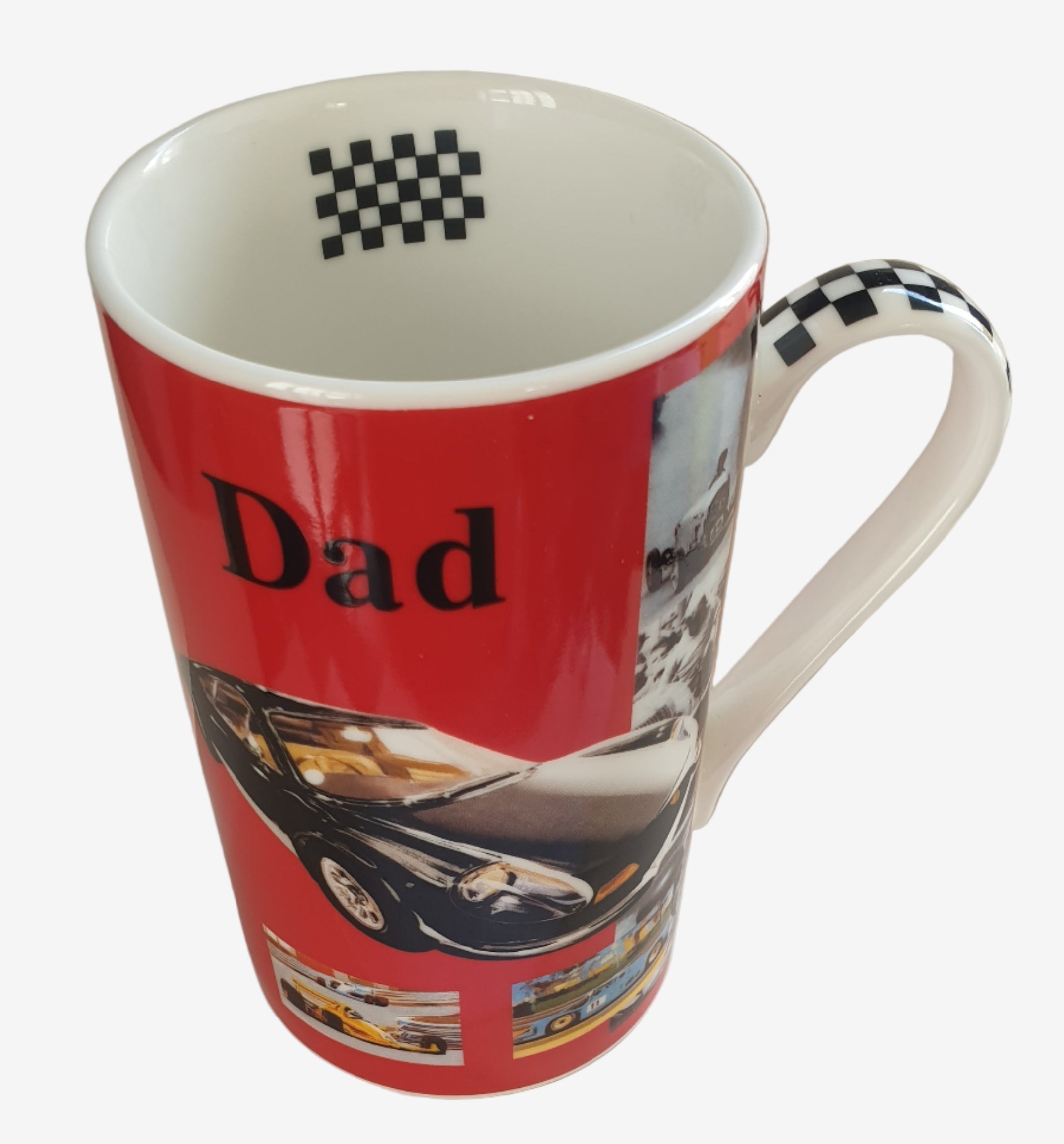 A printed china mug just right for the father who's into all things car racing and race tracks!  Lovely gift for the automotive enthusiast.  Same graphic is printed on vivid red front and back of this mug with checkered flag pattern on the handle and inside the mug.