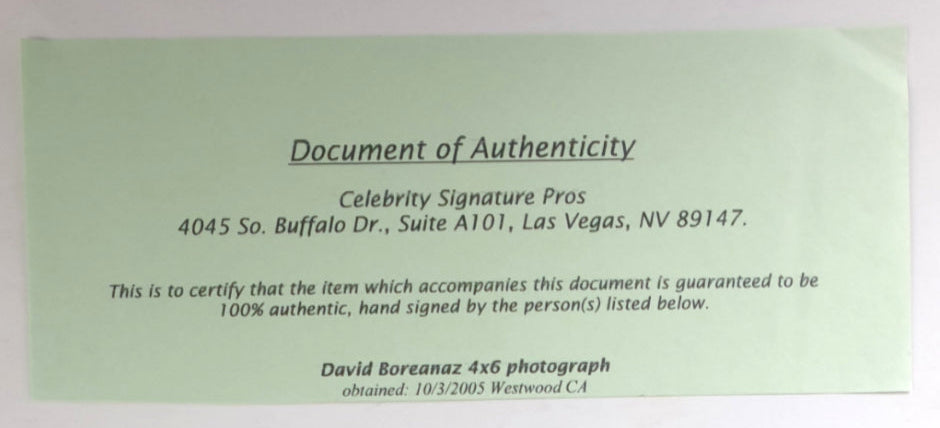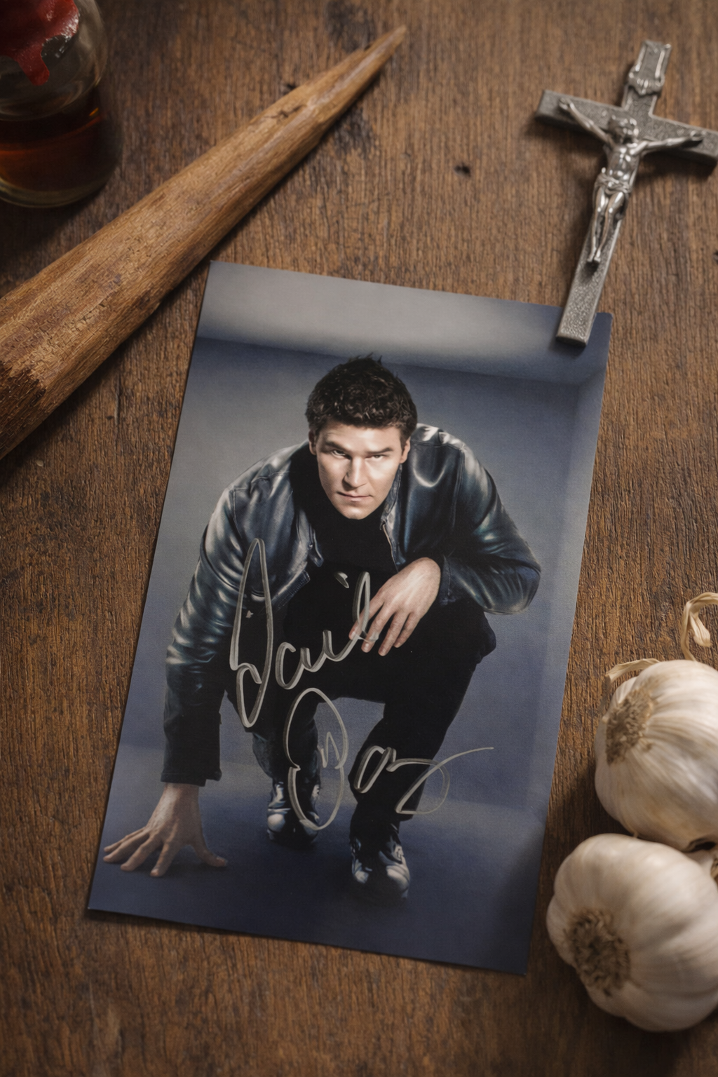 A hand-signed promotional photo of David Boreanaz as Angel, one of the defining characters from Buffy the Vampire Slayer. Angel’s brooding presence and enduring popularity within the Buffyverse make this a strong display piece for collectors of late-90s cult television memorabilia.