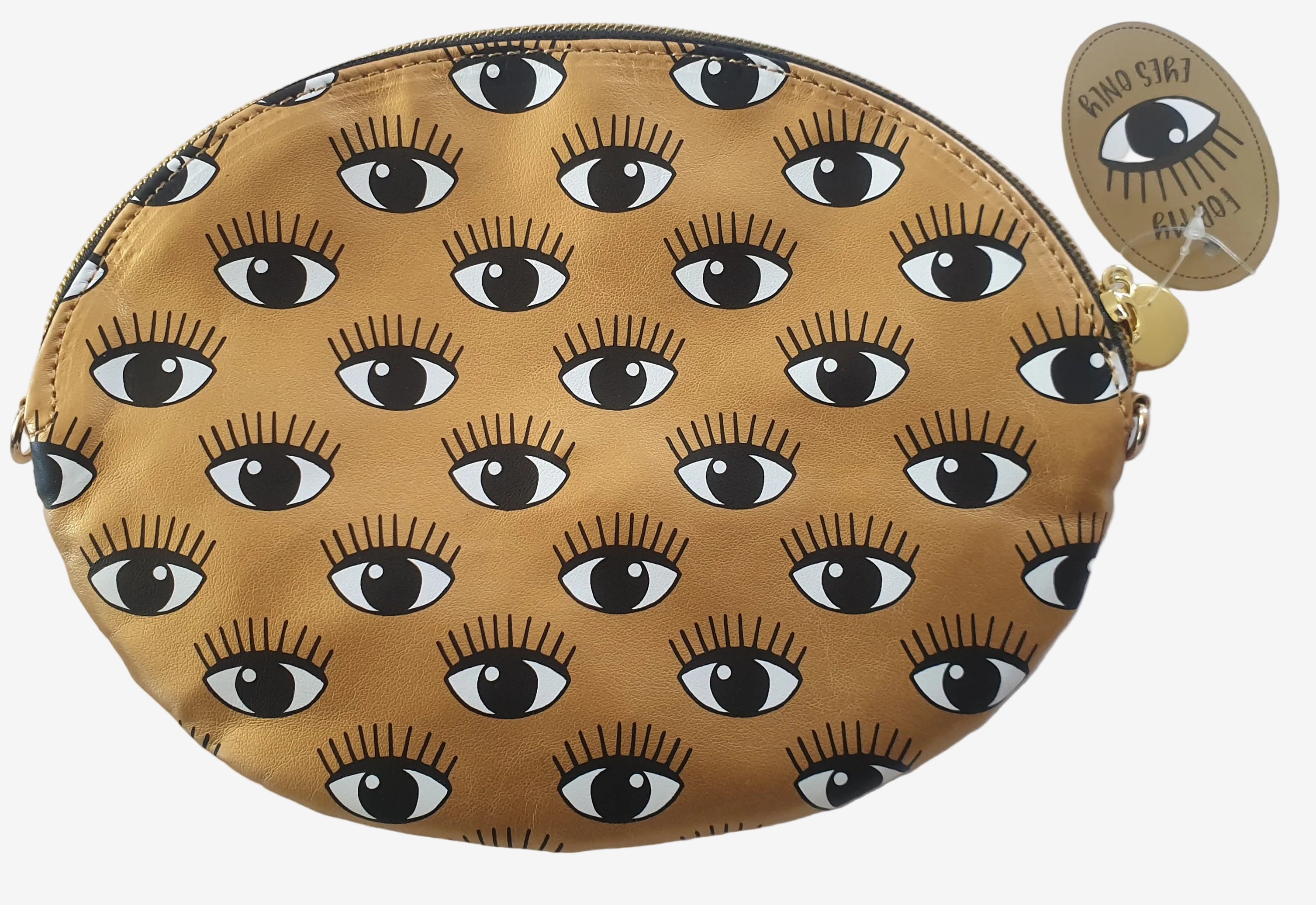 A bold little statement piece with serious retro attitude. This gold shoulder bag features a striking eye graphic on one side, and a pattern of smaller eyes on the other side, giving it that unmistakable new romantic, glam-era edge.