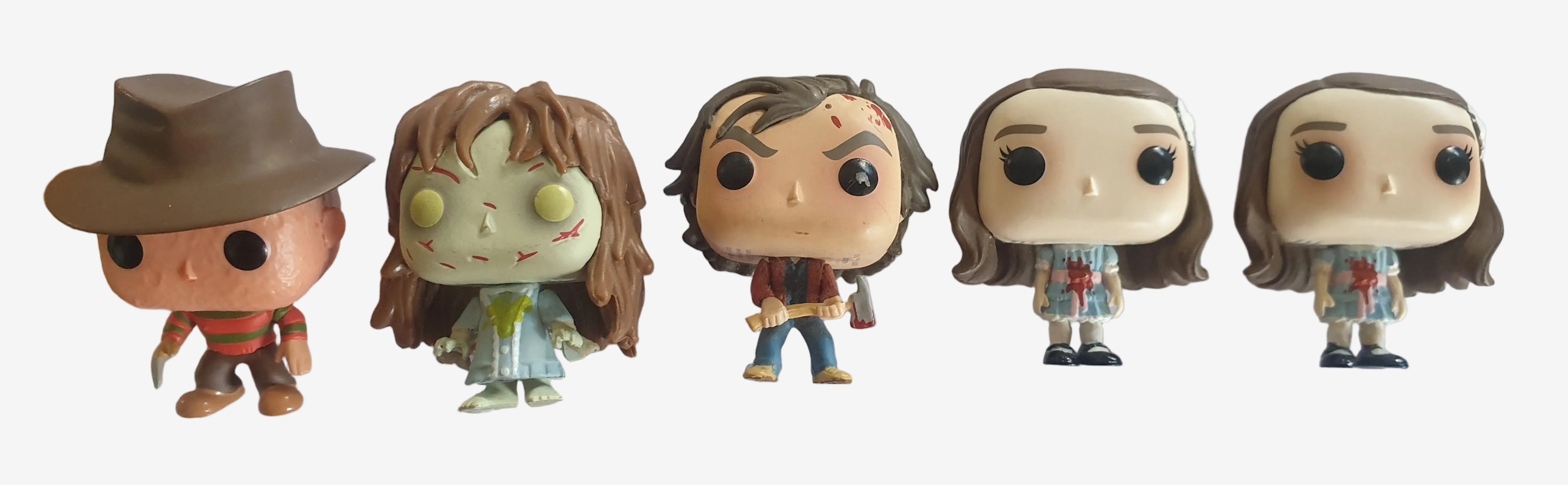 A curated bundle of five Funko horror mini figures, featuring a mix of slasher icons, creepy dolls, and classic monster designs. Ideal for collectors, horror fans, or spooky shelf displays.