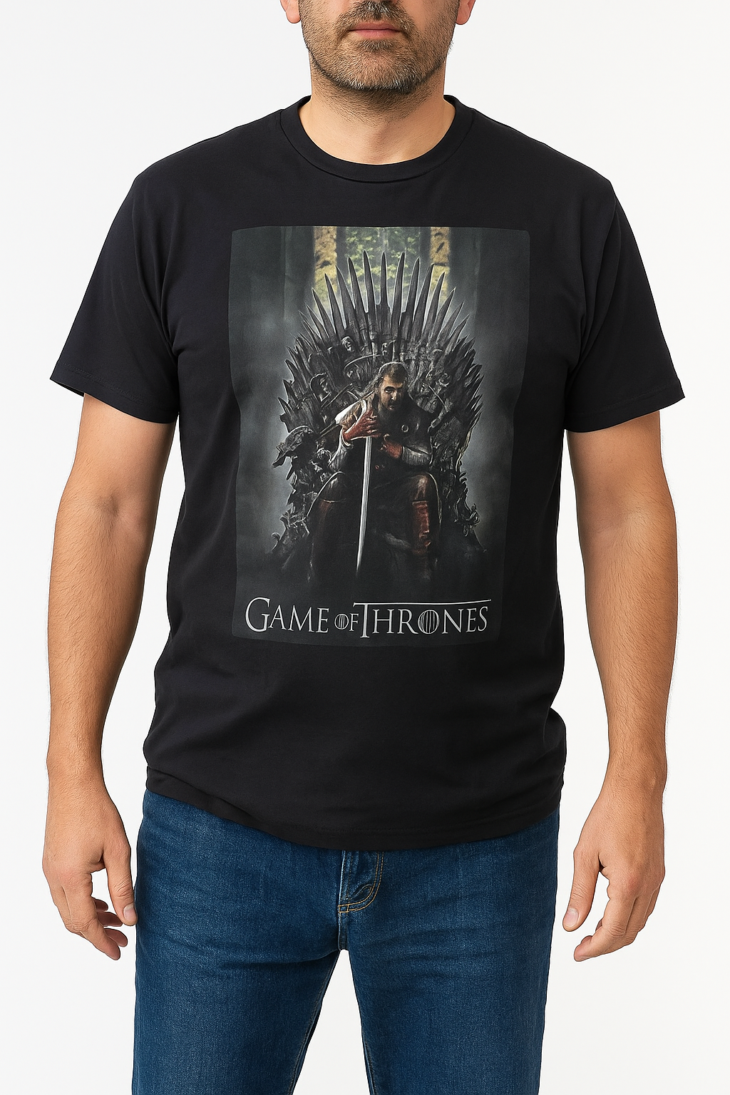 Black tee with Ned Stark on throne image on the front. This is a generous sized t-shirt so please check the measurements.