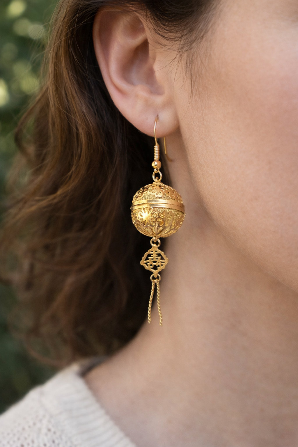 Below the filigree spheres hangs a small decorative charm with two fine chain tassels, adding gentle movement when worn.