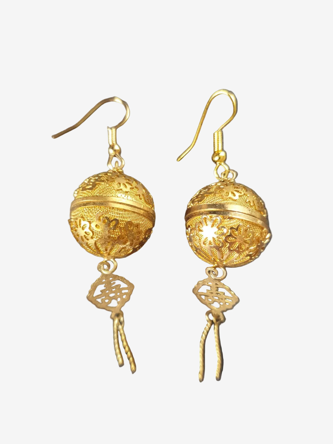 These gold tone filigree dangle earrings feature delicate hollow sphere charms with an ornate floral cut-out pattern. The spherical bead design is lightweight and airy, giving them a lovely vintage-inspired look without being heavy on the ears.