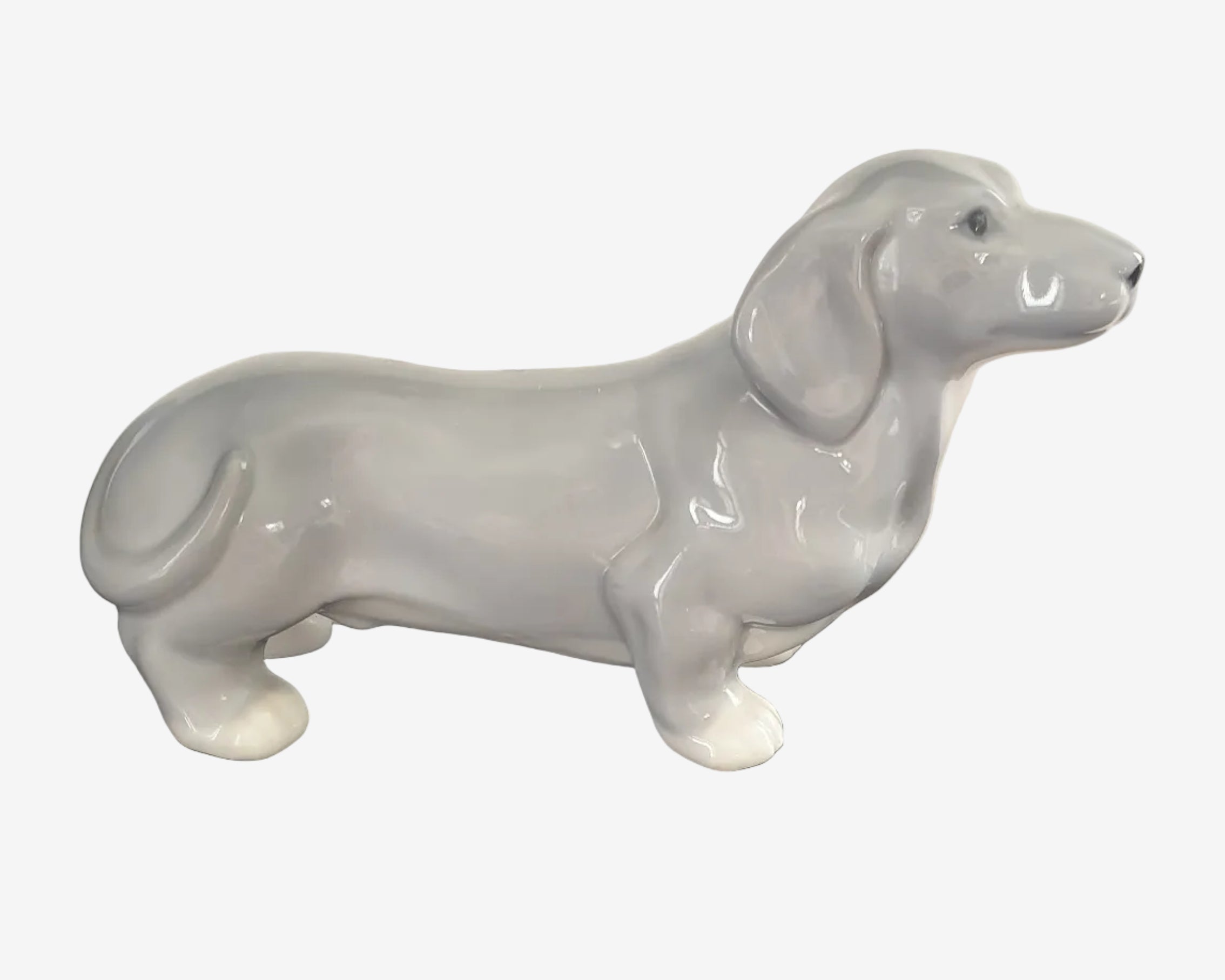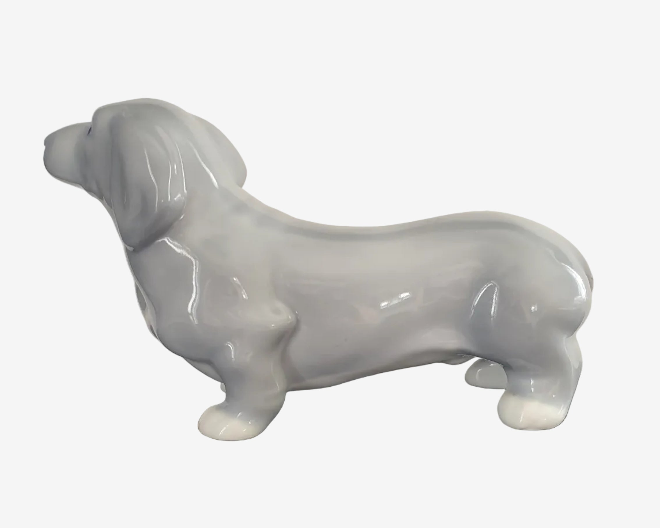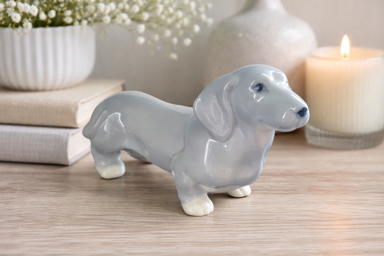 This glossy grey dachshund is full of quiet charm. Just look at that cute butt! Finished in a soft smoke-grey glaze with white paws and gentle detailing, he’s the kind of piece that adds personality without overpowering a space.