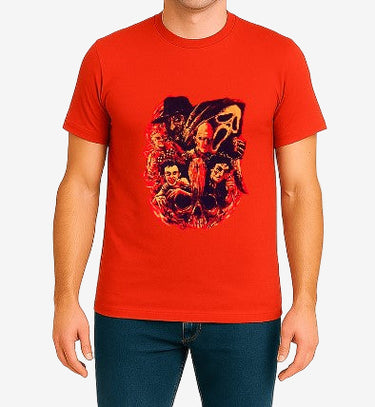 Horror Collage Red T-Shirt graphic print tee. 100% cotton. Awesome horror villains print on front, plain red back. Featuring Freddy Krueger, the Scream and others.
